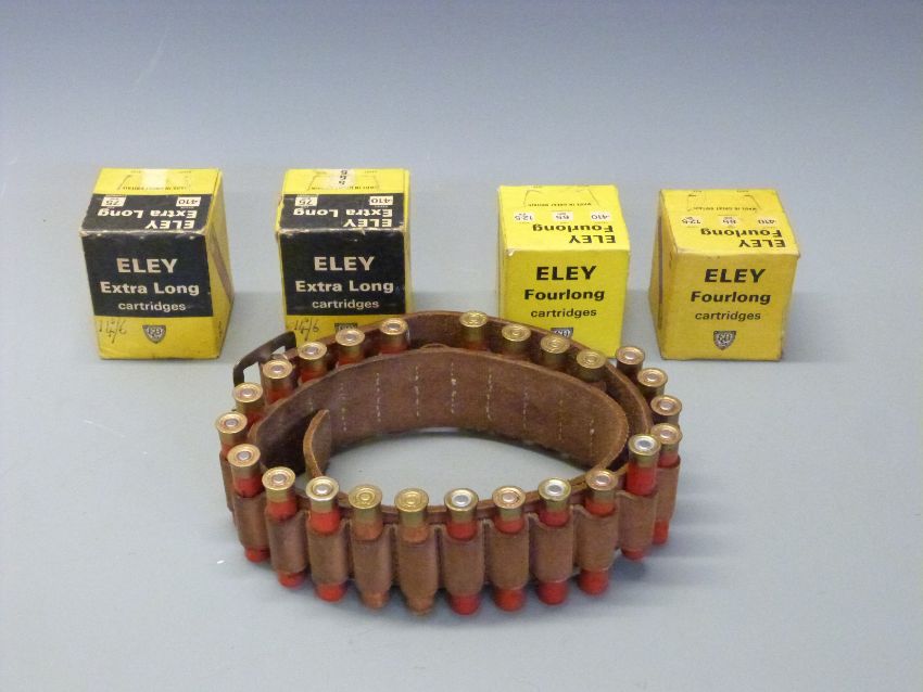 One-hundred-and-twenty-four mainly Eley .410 collectors shotgun cartridges, some in original boxes together with a leather .410 cartridge belt. PLEASE NOTE THAT A VALID RELEVANT FIREARMS/SHOTGUN CERTIFICATE IS REQUIRED TO HANDLE/PURCHASE THIS ITEM.
