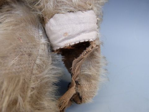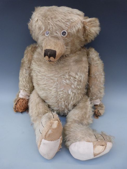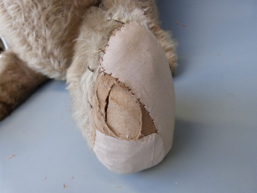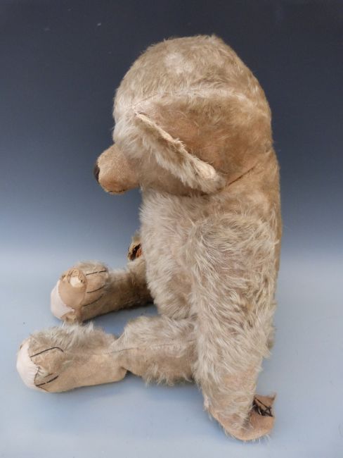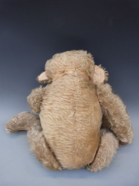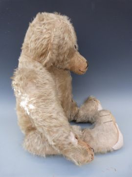 Attributed to Steiff Teddy bear with blonde mohair, shaved snout, growler, straw body, cocked feet and wrists and stitched nose and paws, 73cm tall