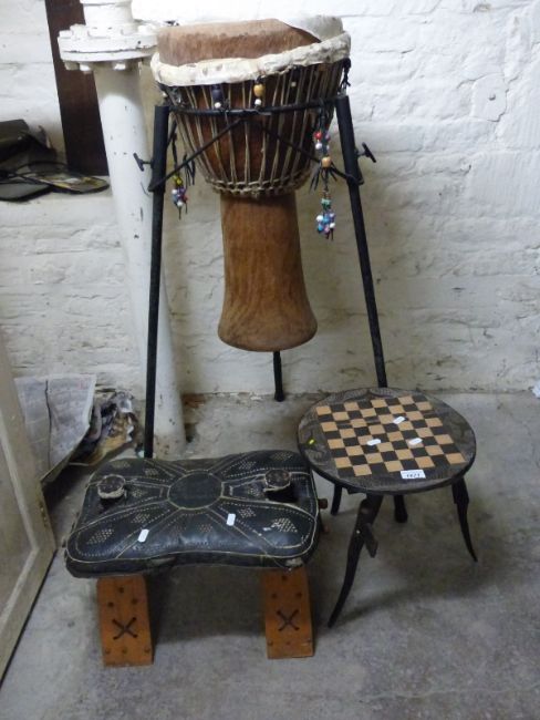 An African drum on metal stand, camel stool and a carved chess table