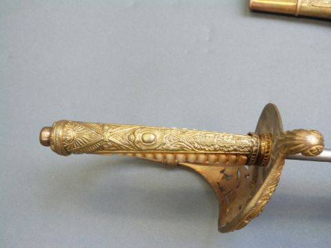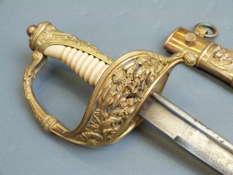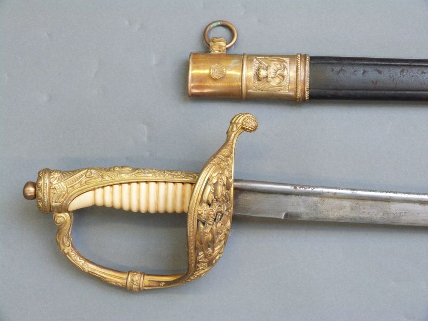 Dutch 1843 pattern Naval officer's sword, with 70cm engraved blade and metal mounted leather scabbard