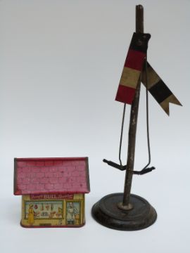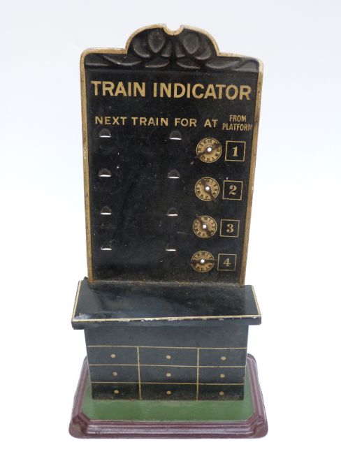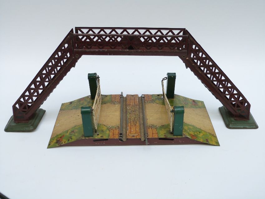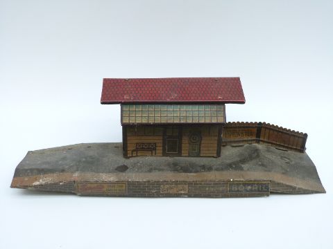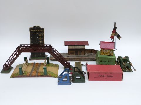 Twelve Bing and Hornby 0 gauge buildings and accessories including a Train Indicator, Station, Buffer Stops, Footbridge, Signal etc, some in original boxes