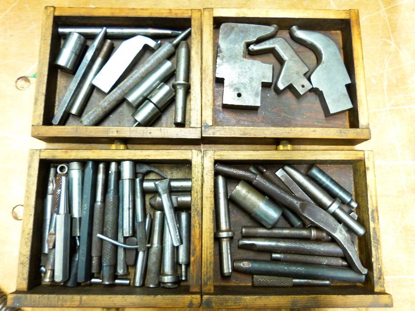 A vintage wooden toolmaker's chest and contents to include punches, laps etc