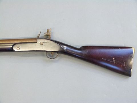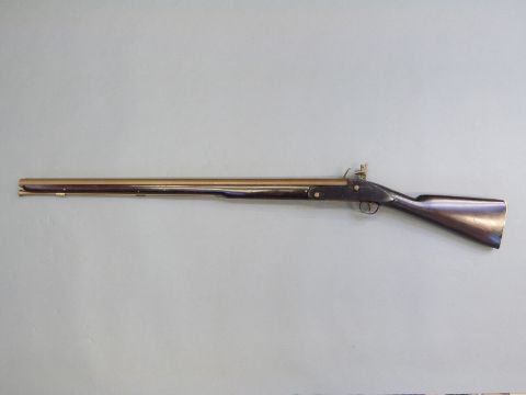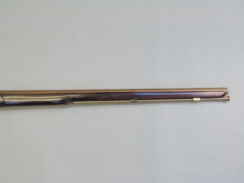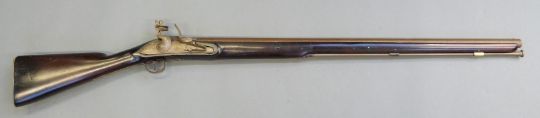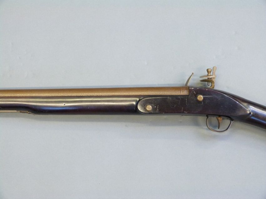Flintlock hammer action musket with engraved Roman type lock, engraved brass trigger guard, brass mounts and butt plate, steel ram-rod, and 33.5inch barrel, overall length 125cm.