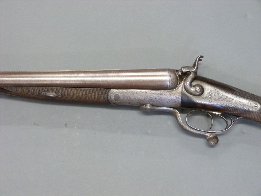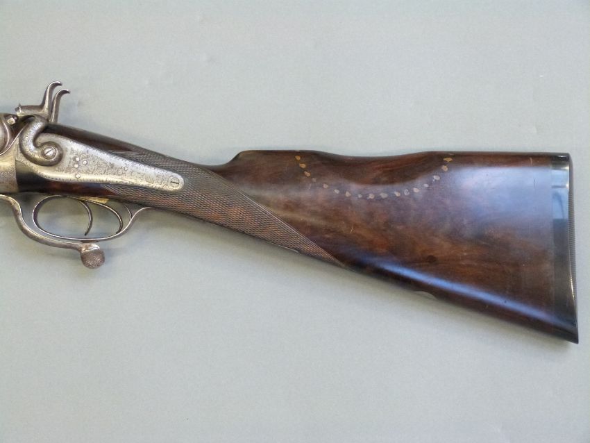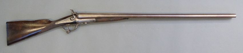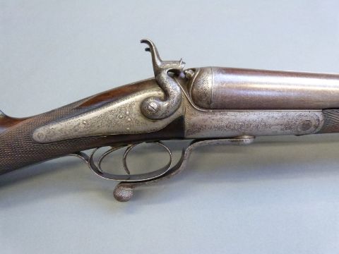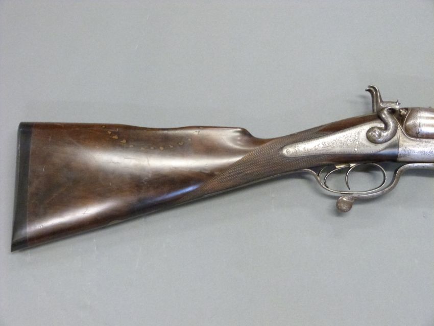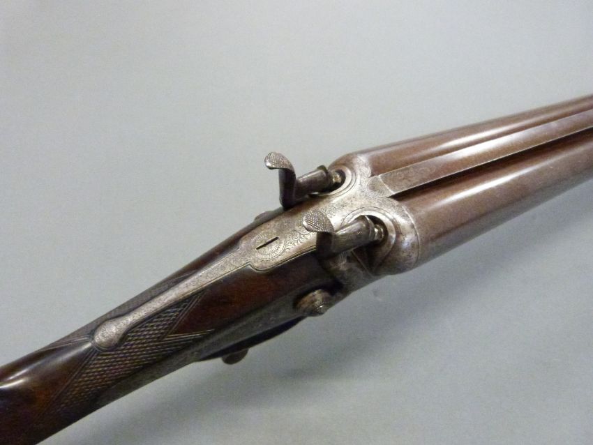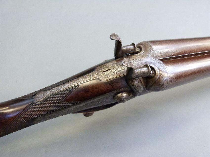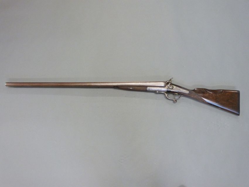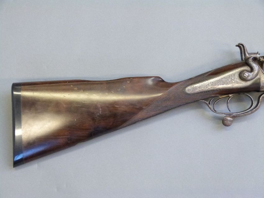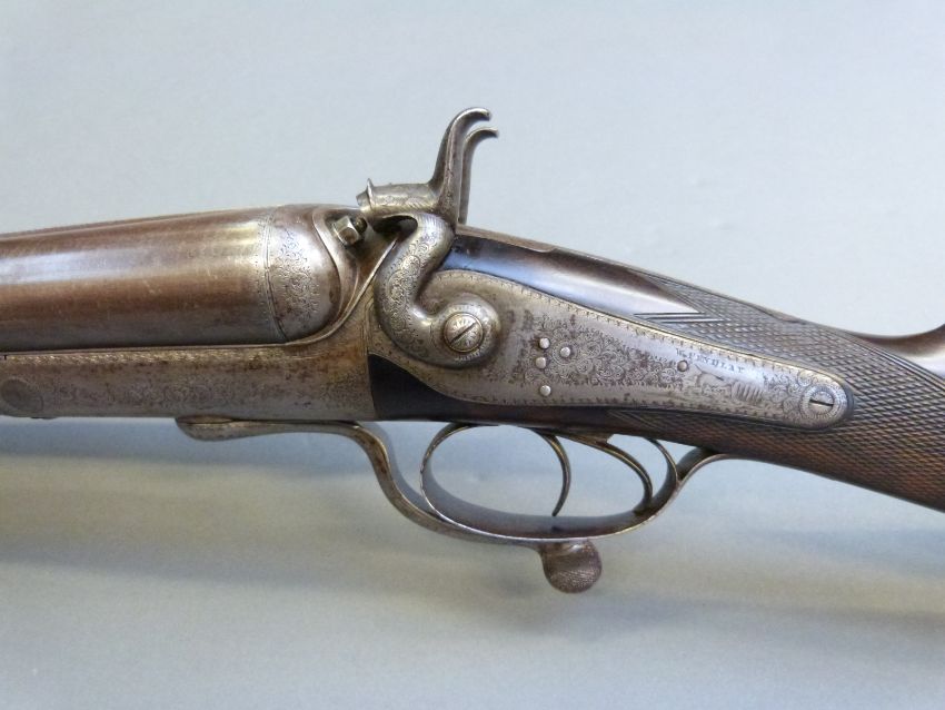W Findley of Kingston by Forfar 8 bore side by side percussion hammer action gun with name, scenes of dogs flushing birds and scrolling decoration engraved to the locks, all over scrolling engraving, stylised dolphin hammers, rotary underlever, chequered grip, horn tipped forend and 36 inch named and engraved Damascus barrels, overall length 134cm.