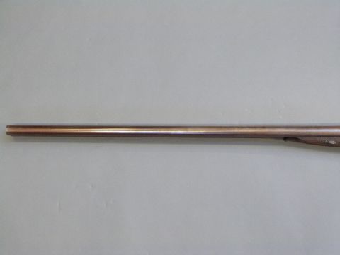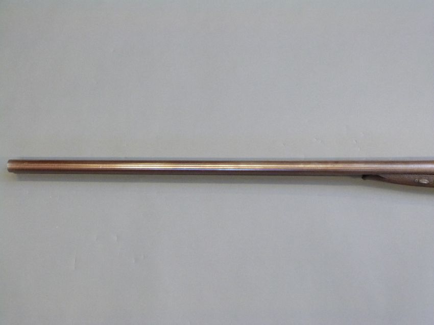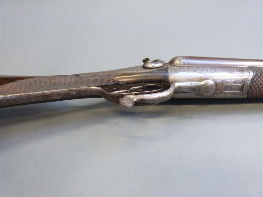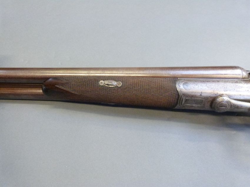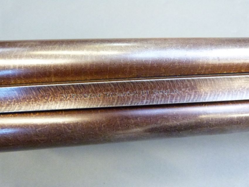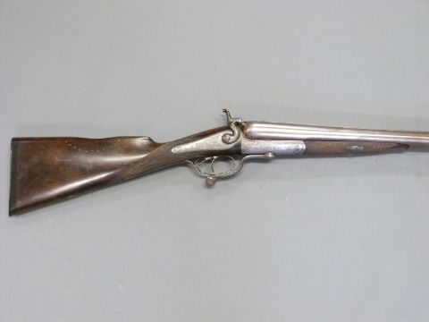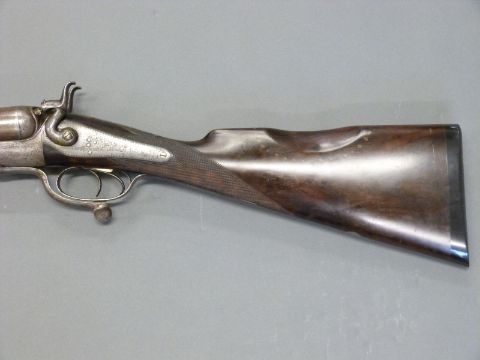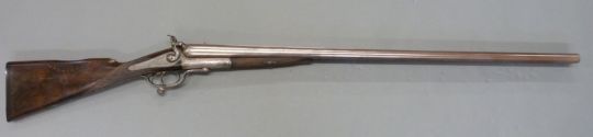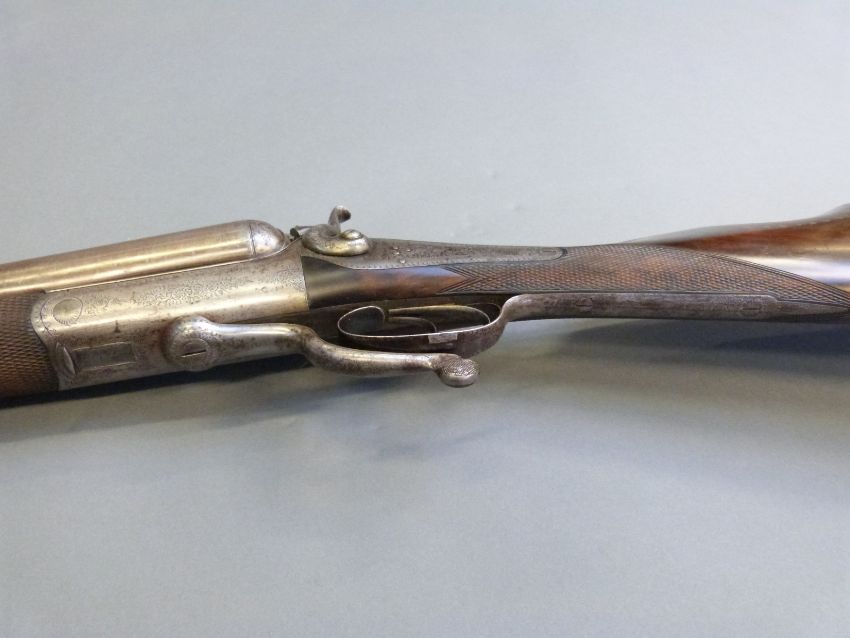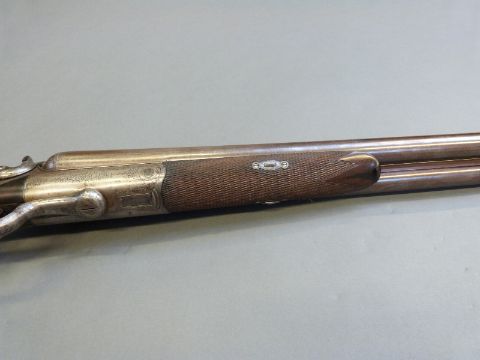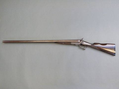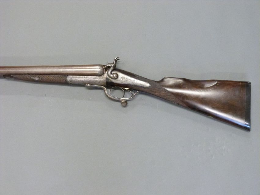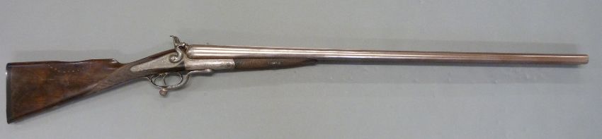 W Findley of Kingston by Forfar 8 bore side by side percussion hammer action gun with name, scenes of dogs flushing birds and scrolling decoration engraved to the locks, all over scrolling engraving, stylised dolphin hammers, rotary underlever, chequered grip, horn tipped forend and 36 inch named and engraved Damascus barrels, overall length 134cm.