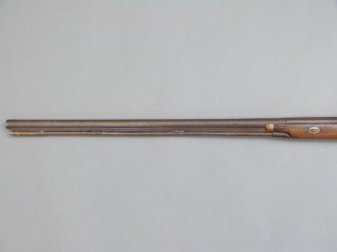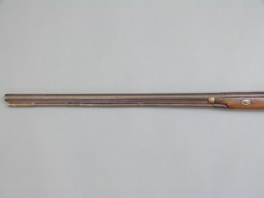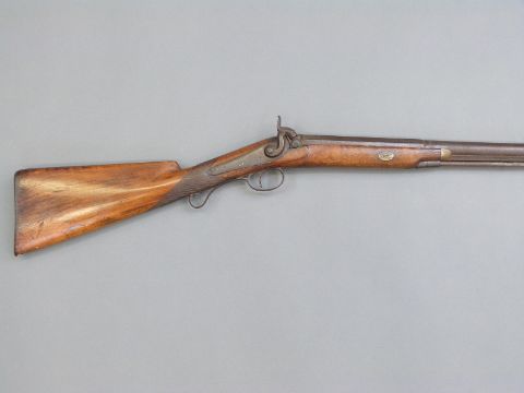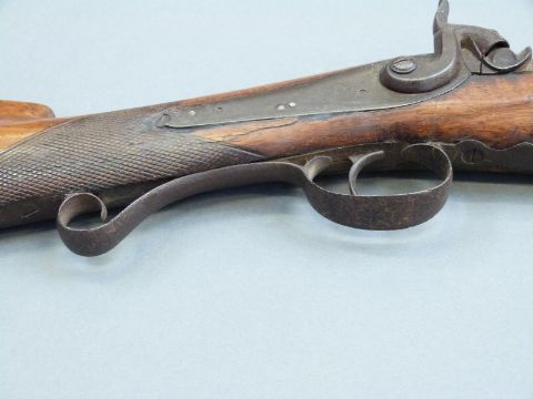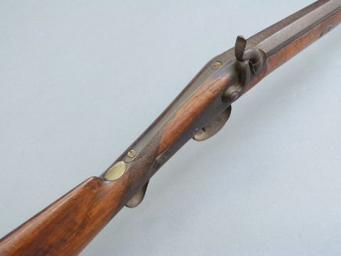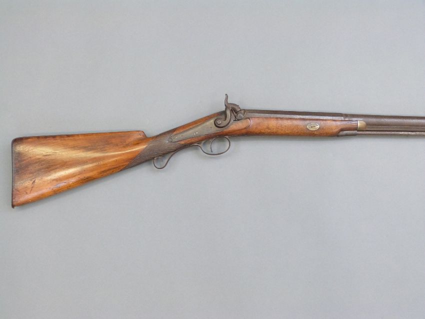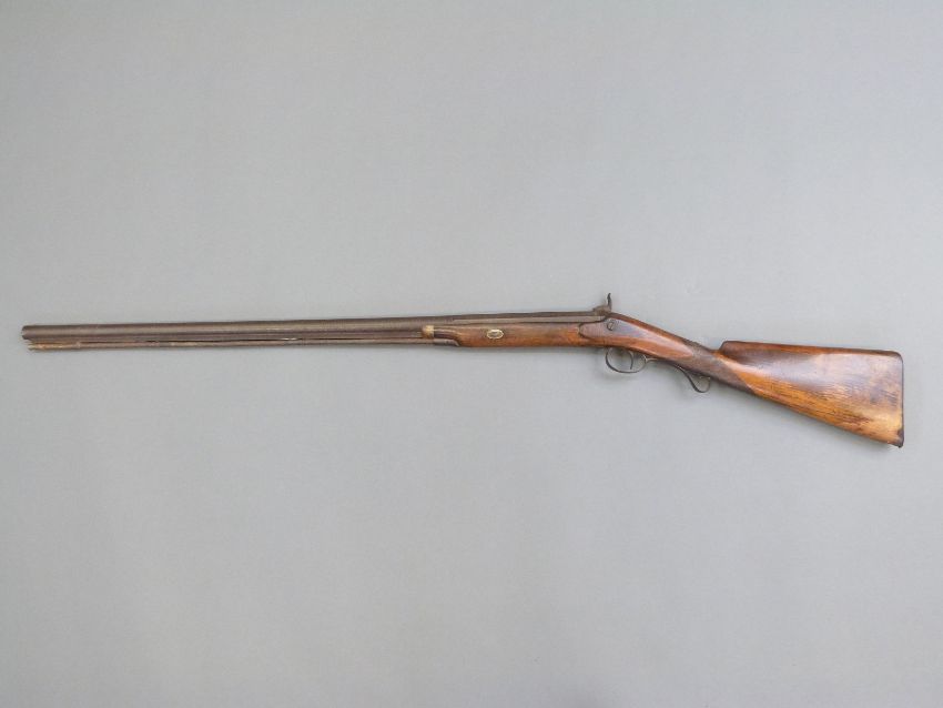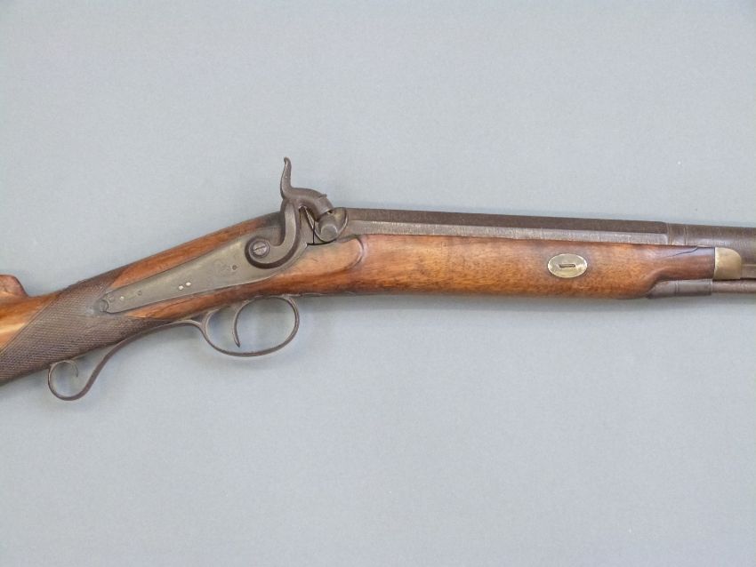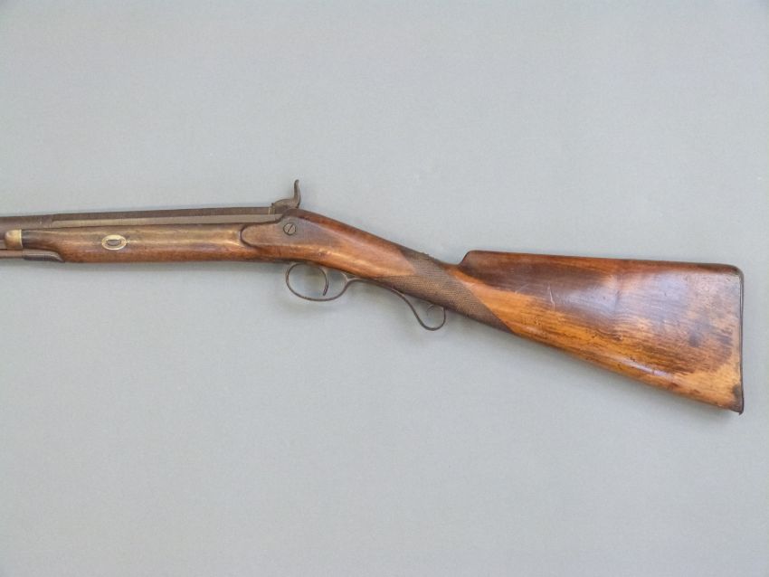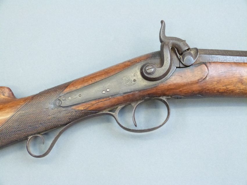 Percussion hammer action gun with engraved lock, scrolling trigger guard, brass tipped ram-rod, chequered grip and 31 inch part octagonal barrel, overall length 120cm.
