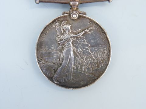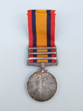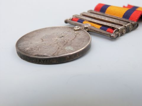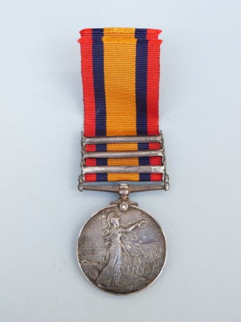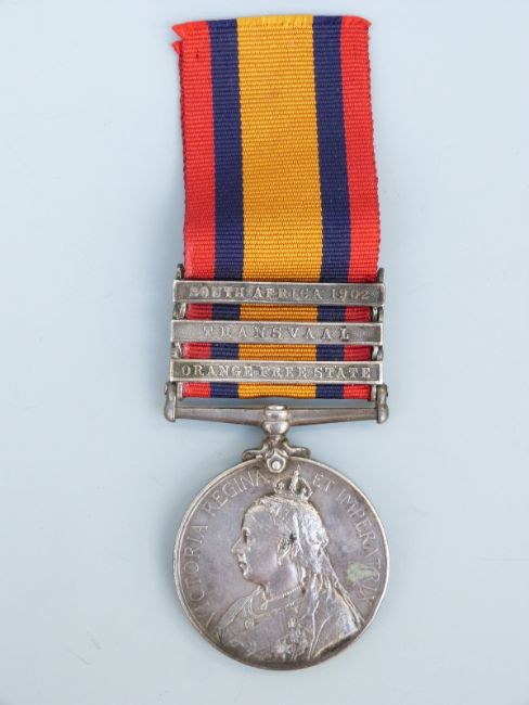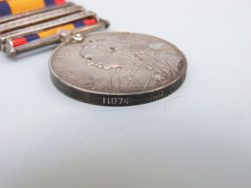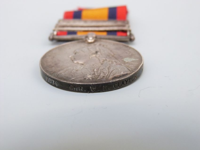 A Queen's South Africa medal with three clasps, South Africa 1902, Transvaal and Orange Free State named to 11074 Gunner W H Clayton, Royal Artillery