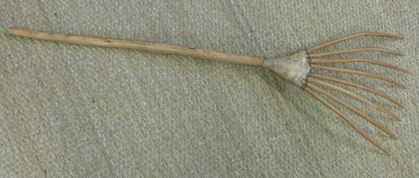 A wooden rake formed from tapered wood bound with leather, possibly tribal, appears unused