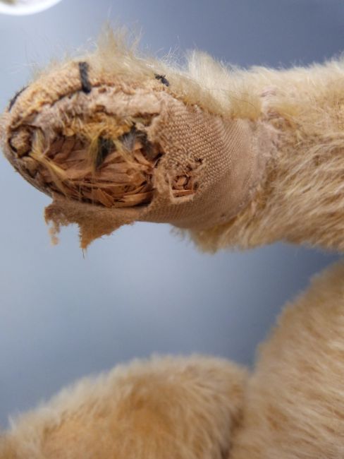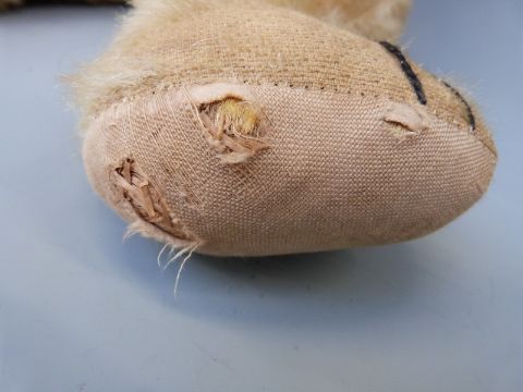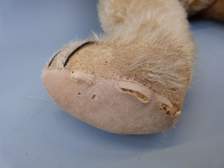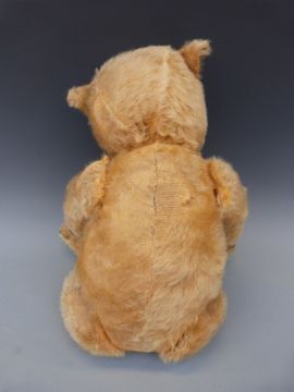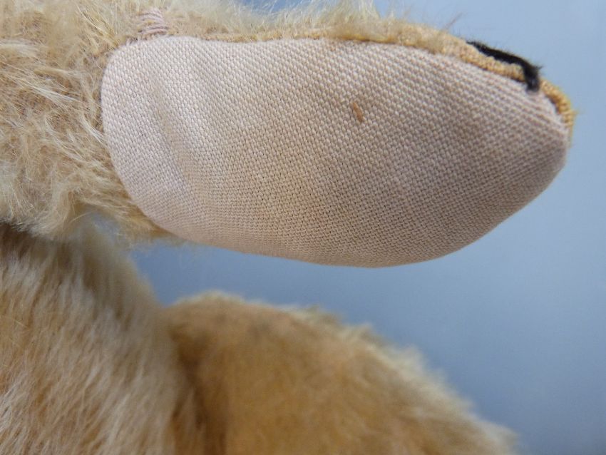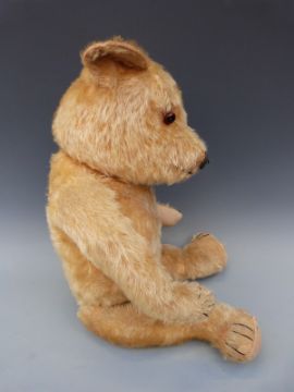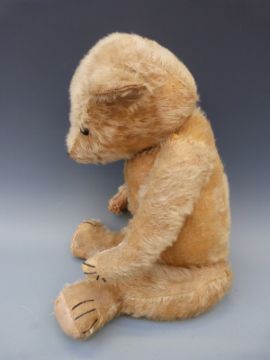 A vintage mohair teddy bear with glass eyes, cocked wrists and 90° feet, 63cm long