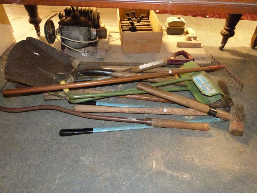 A quantity of garden tools, tea trolley etc