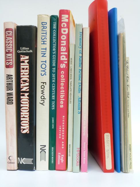 Fourteen toy and doll reference books including Classic Kids, American Motortoys, British Tin Toys, McDonalds Collectibles, Kathe Kruse Dolls and hand compiled books on robots and Meccano