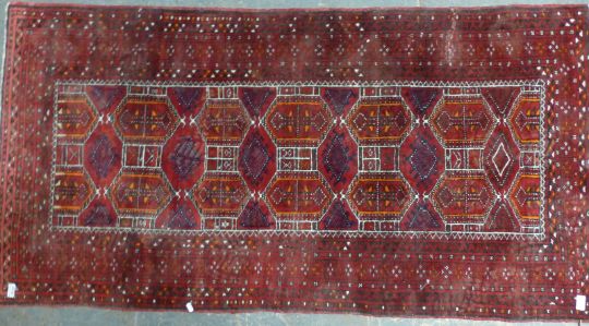 A Turkoman rug with central panel of guls on a wine ground (76 x 90cm)