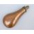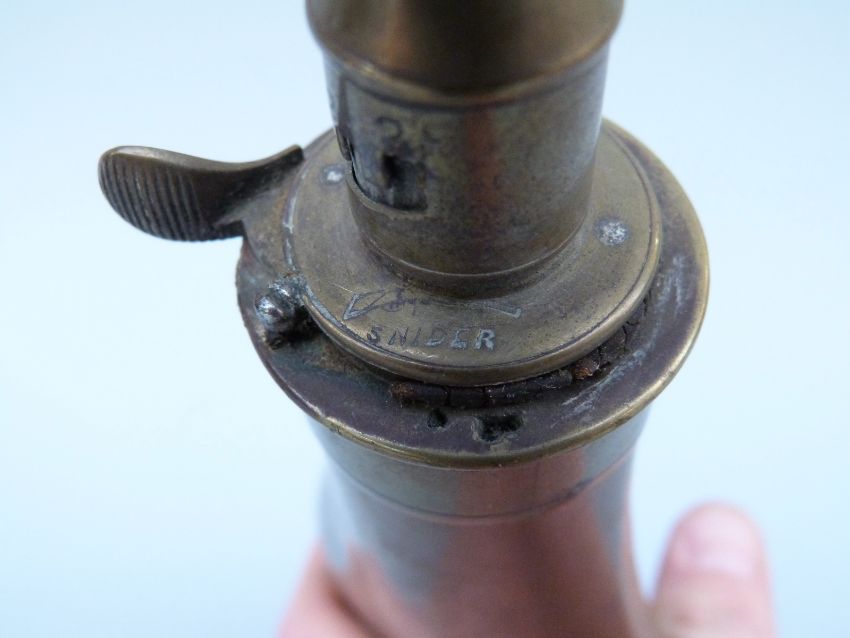 Copper and brass powder flask stamped 'Snider' under a gun logo, 19cm long.