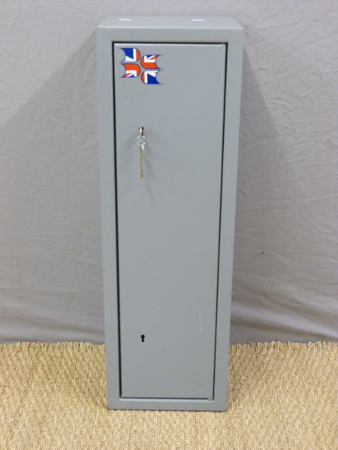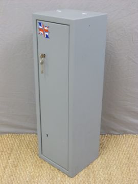 A small gun cabinet / safe with two sets of keys and mounting bolts together with a faux leather cartridge belt.