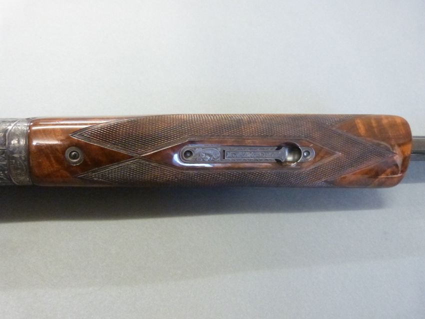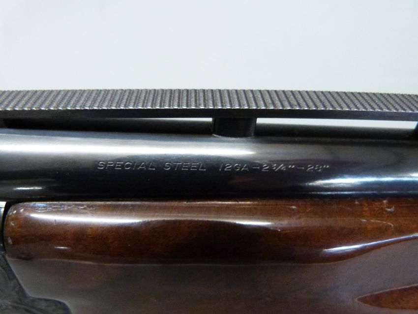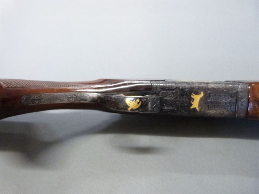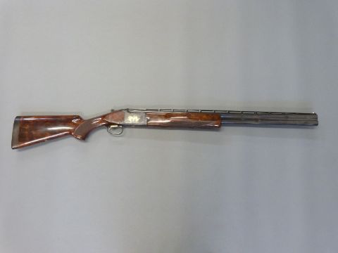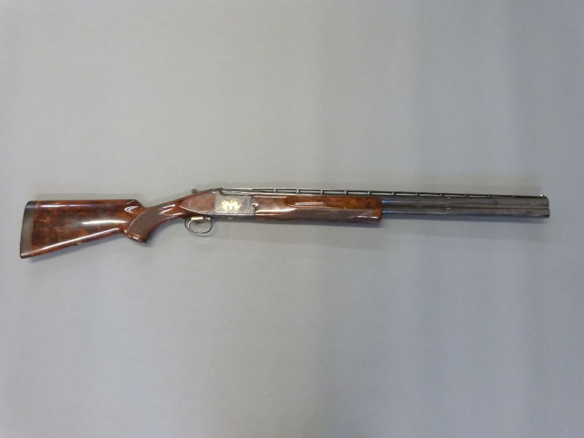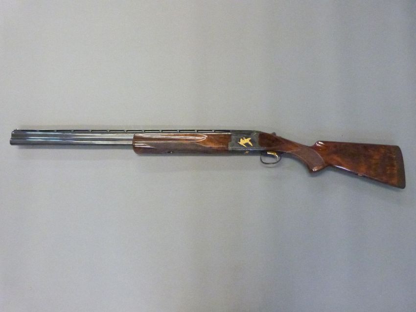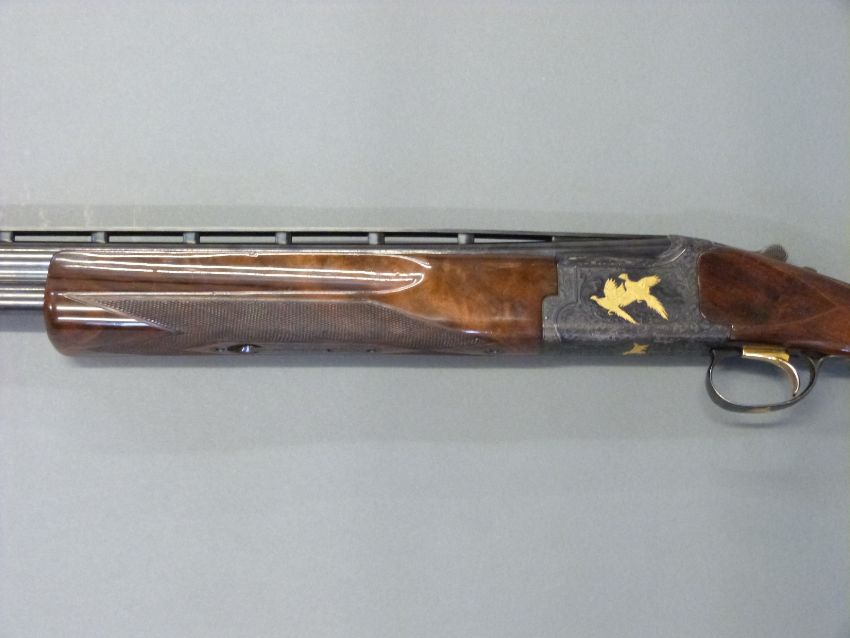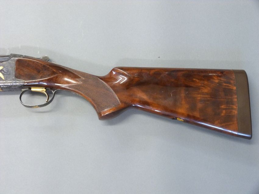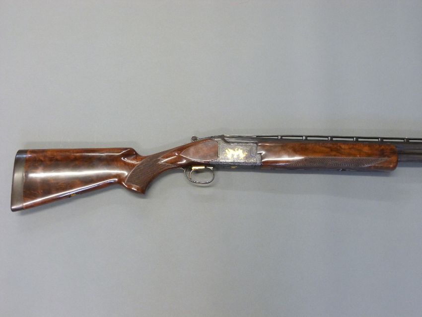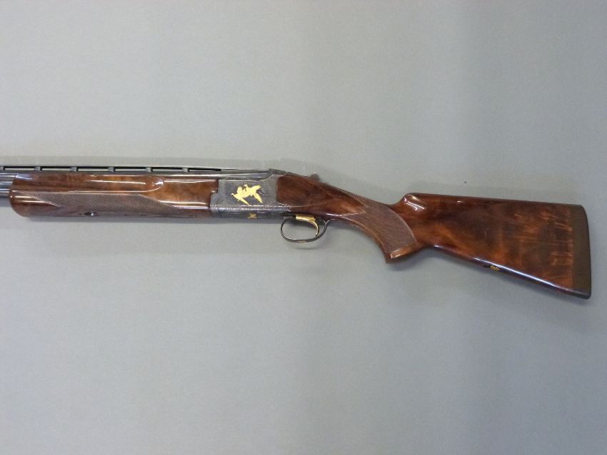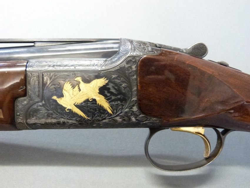 Browning 12 bore over and under shotgun with all over scrolling engraving and scenes of birds engraved to the lock highlighted in gilt against a black ground, chequered semi-pistol grip and trap forend, single gilt trigger, raised vented top rib and 28 inch multi-choke barrels, overall length 114cm, length of pull 36cm, serial number 27033PR6B3. PLEASE NOTE THAT A VALID RELEVANT FIREARMS/SHOTGUN CERTIFICATE IS REQUIRED TO HANDLE/PURCHASE THIS ITEM.