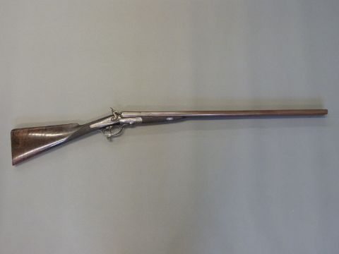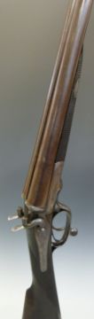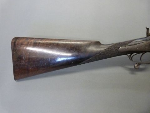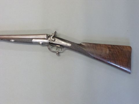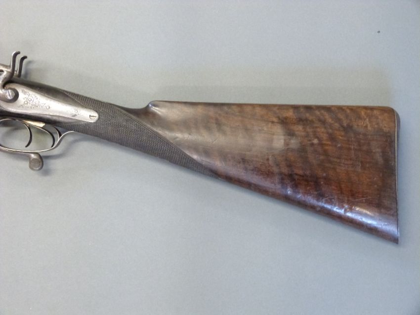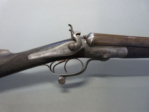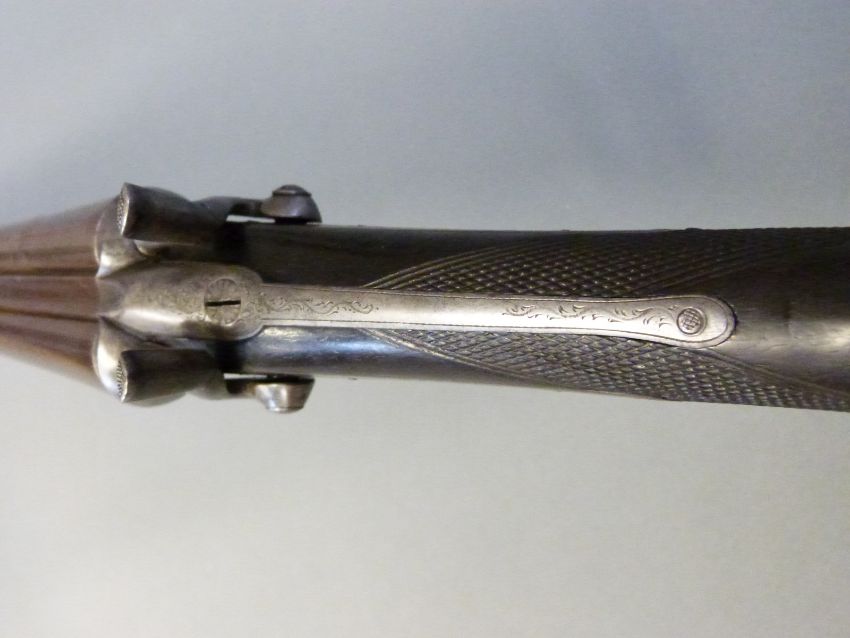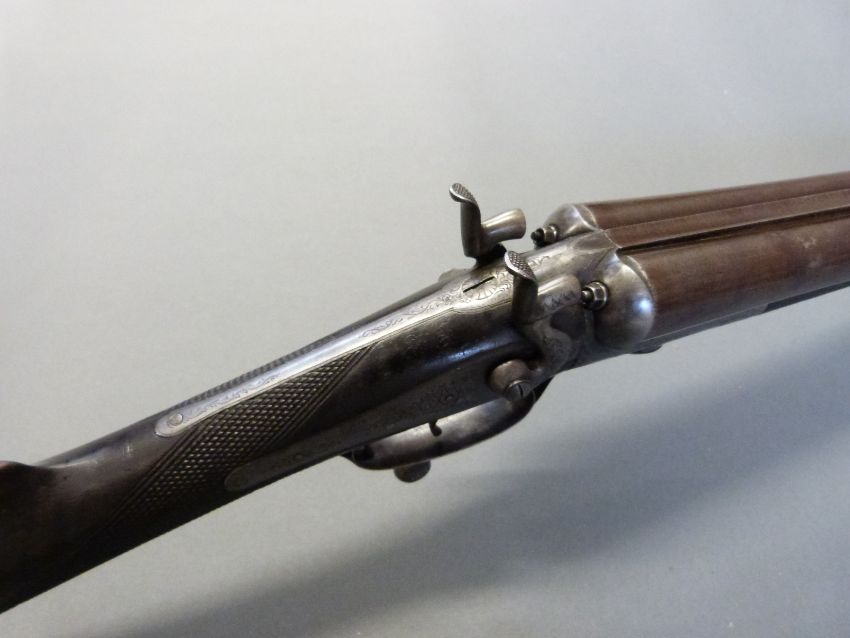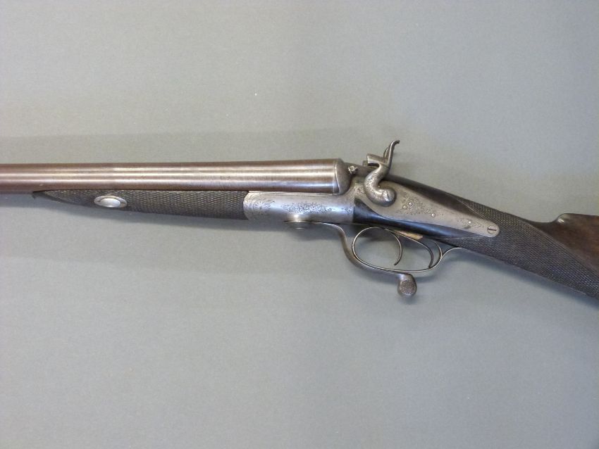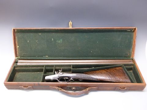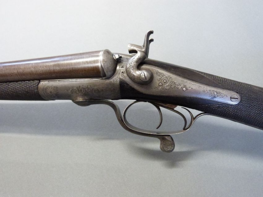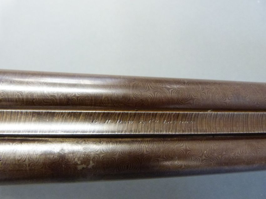 Geroge H Daw & Co 12 bore side by side hammer action shotgun with named and engraved locks, stylised dolphin hammers, rotary underlever, double trigger, chequered grip and forend and 30 inch Damascus barrels engraved 'G.H.Daw & Co, London.', overall length 118cm, length of pull 37cm, NVSN, in fitted brown leather case with British India Line label. PLEASE NOTE THAT A VALID RELEVANT FIREARMS/SHOTGUN CERTIFICATE IS REQUIRED TO HANDLE/PURCHASE THIS ITEM.
