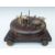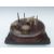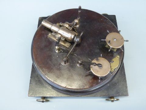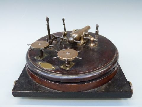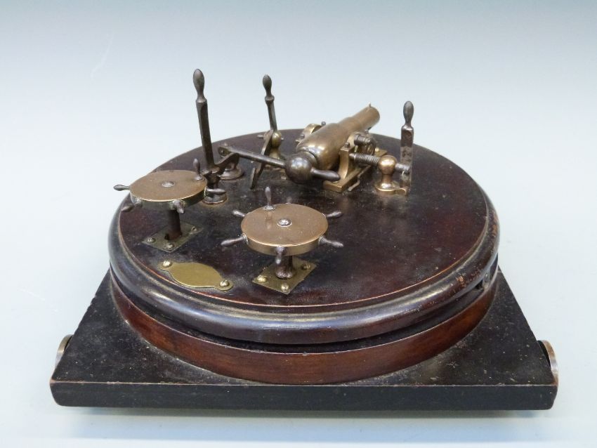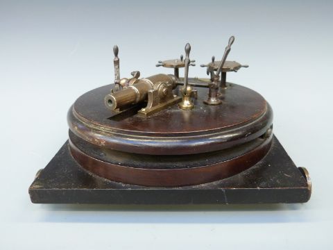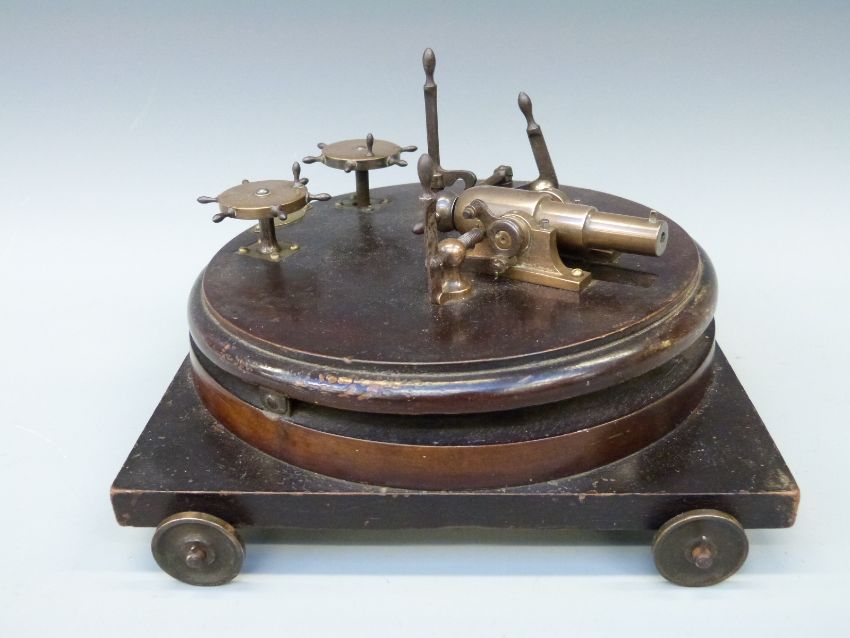 A working bronze model of a cannon with 3.25 inch three stage barrel, arm mounted hammer with levers for loading and firing and two bronze ships wheel style dials used to rotate and tilt the base, all mounted on a wheeled mahogany carriage with vacant brass plaque, 23x24cm.