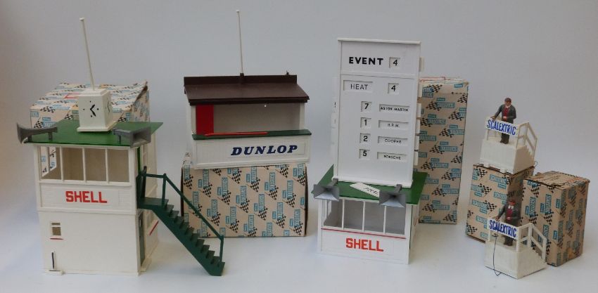 Five Tri-ang Scalextric model motor racing buildings and accessories comprising Event Board and Hut A201, Control Tower A208, Racing Pit A202 and two Starter on Rostrum figures F303, all in original boxes