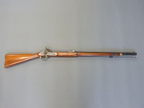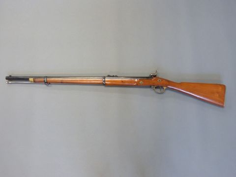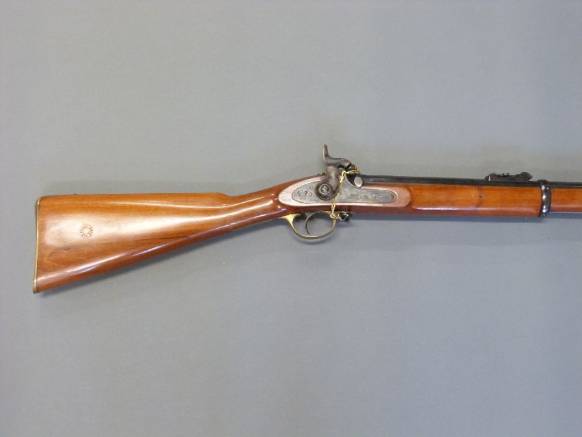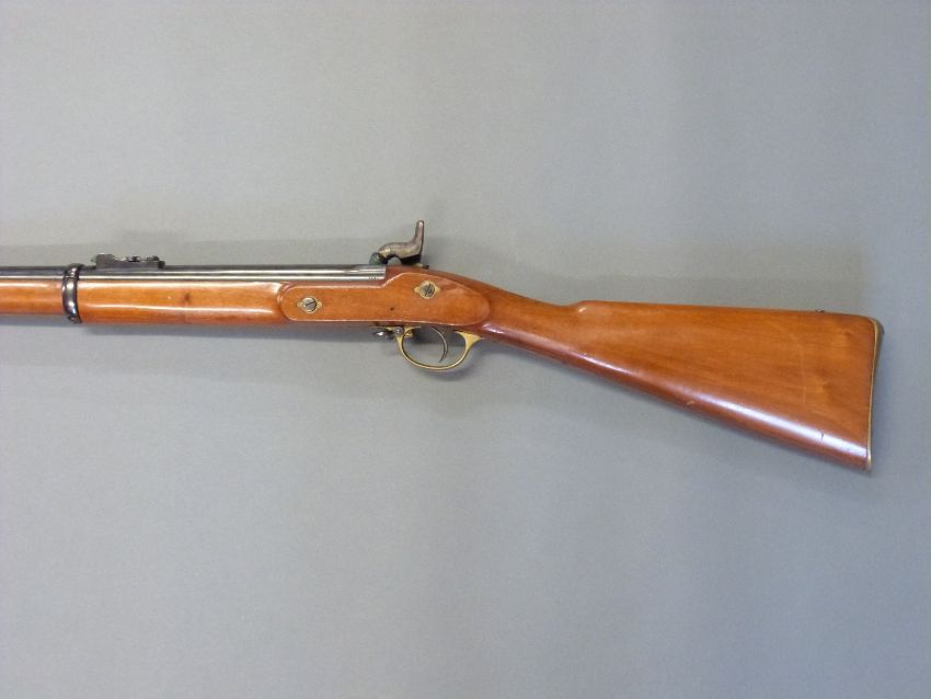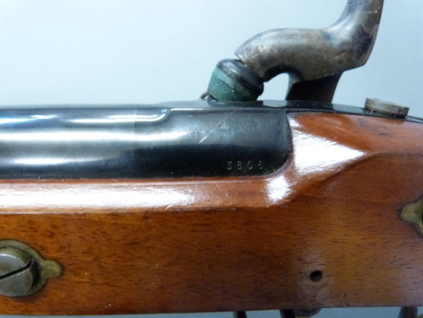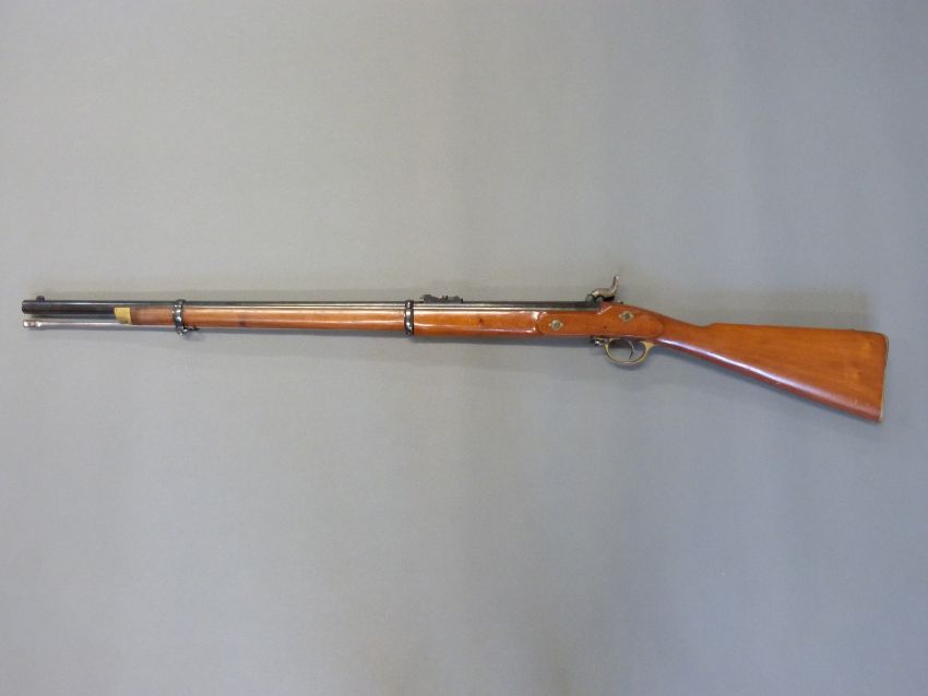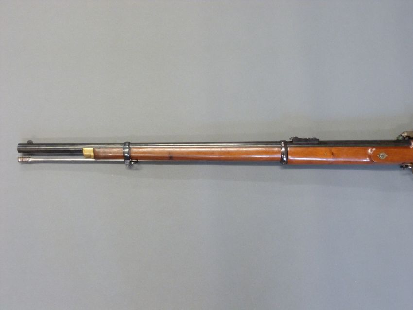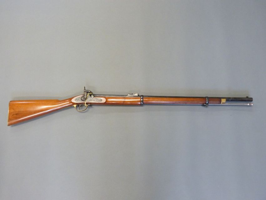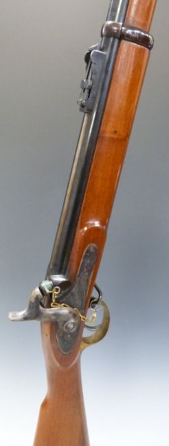 Parker-Hale Enfield .564 two band percussion hammer action rifle with lock stamped 1858 Enfield and with crown over P-H cypher, brass butt plate and trigger guard, sling suspension loops, bayonet mount, adjustable sights, steel ram-rod and 32 inch barrel, overall length 124cm, serial number 3806. PLEASE NOTE THAT A VALID RELEVANT FIREARMS/SHOTGUN CERTIFICATE IS REQUIRED TO HANDLE/PURCHASE THIS ITEM.