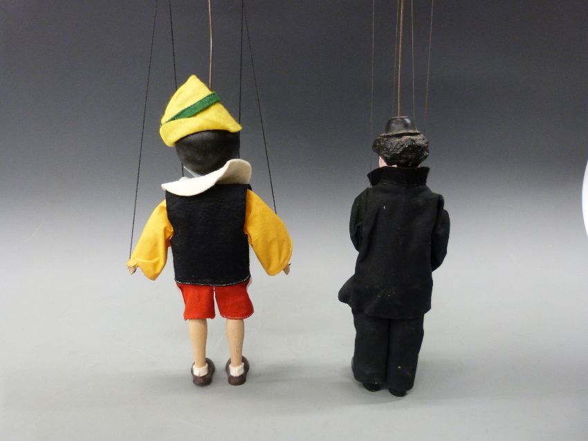 Two vintage puppets Pinnocchio and Charlie Chaplin each approximately 30cm tall excluding wires.