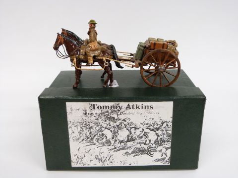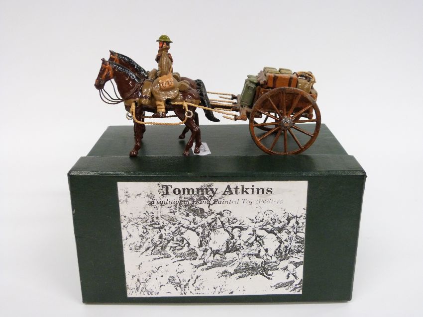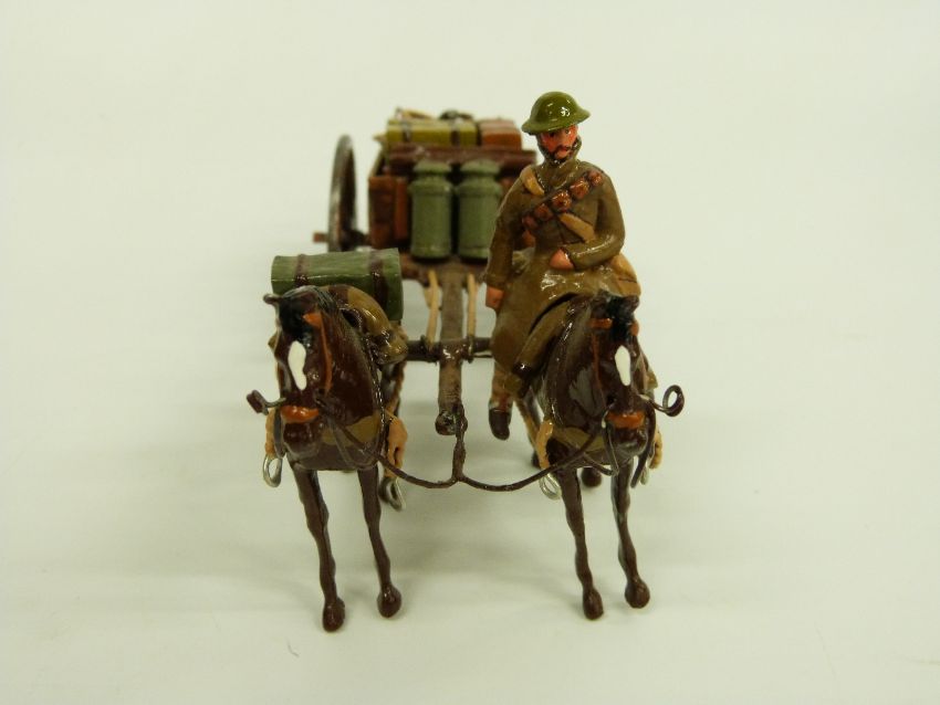 Tommy Atkins diecast WWI German soldier Supply Cart set comprising two horses and one soldier towing a wagon, in original box