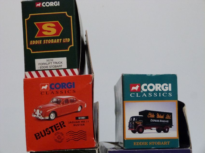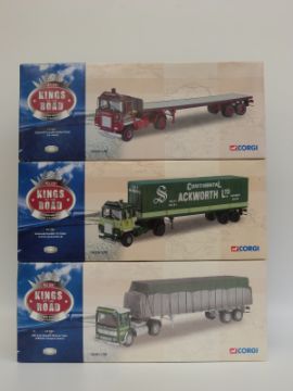 Three Corgi Kings of the Road limited edition diecast model lorries CRTS Ackworth Scammell Crusader Tilt Trailer CC12602, Willmotts Transport AEC Ergo Sheeted Platform Trailer CC10301 and J R Adams Scammell Crusader Flatbed Trailer CC12601, all in original boxes