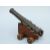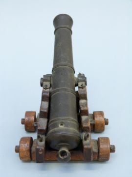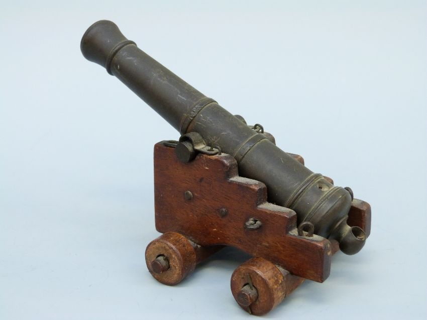A bronze table cannon with 6.5 inch multi stage barrel on a wooden wheeled carriage.