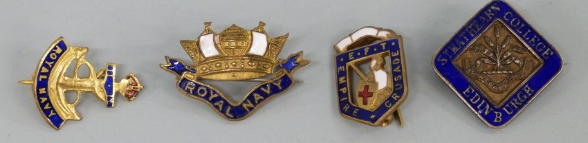 Four enamelled badges, one hallmarked silver relating to Strathearn College Edinburgh, one EFT Empire Crusade and two Royal Navy