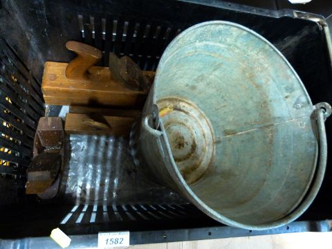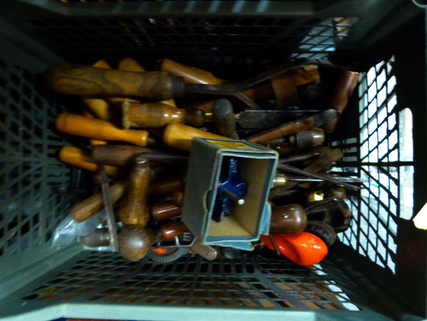 A quantity of vintage woodworking tools to inlude boxed Record 722 plane, chisels, drills, bucket etc