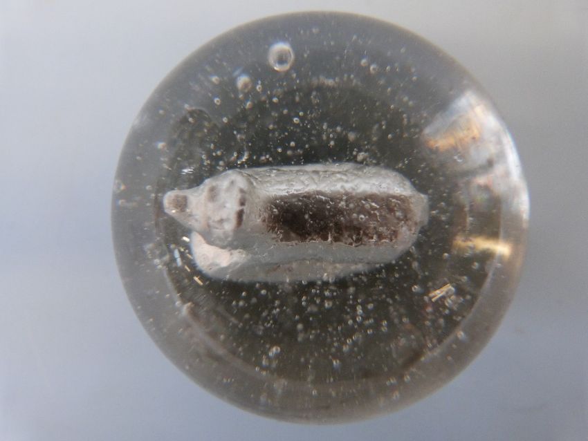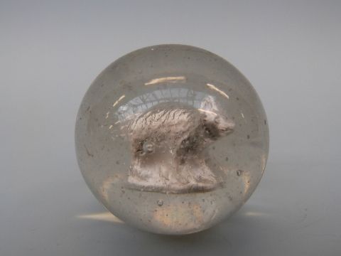 A large glass marble with sulphide cameo in the form of a dog or bear, approximately 42mm in diameter