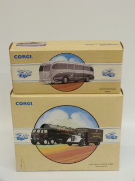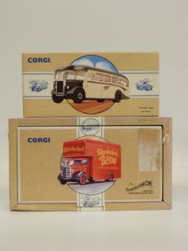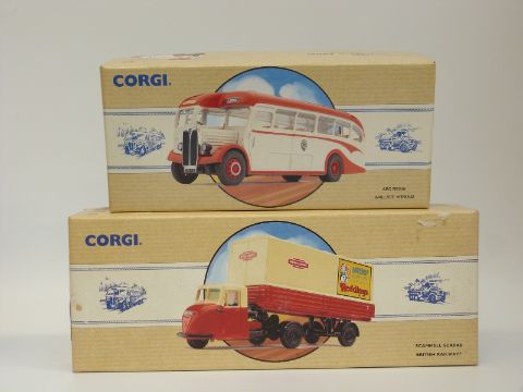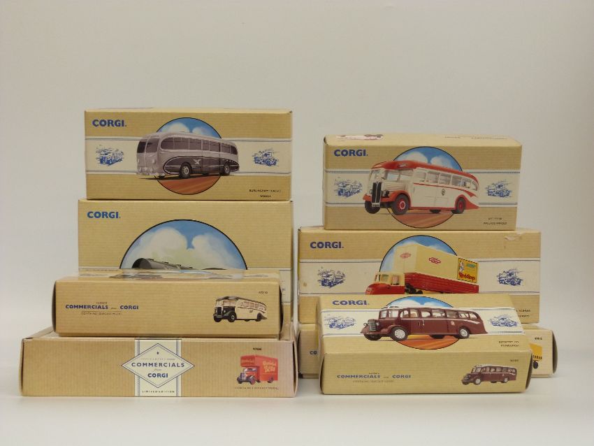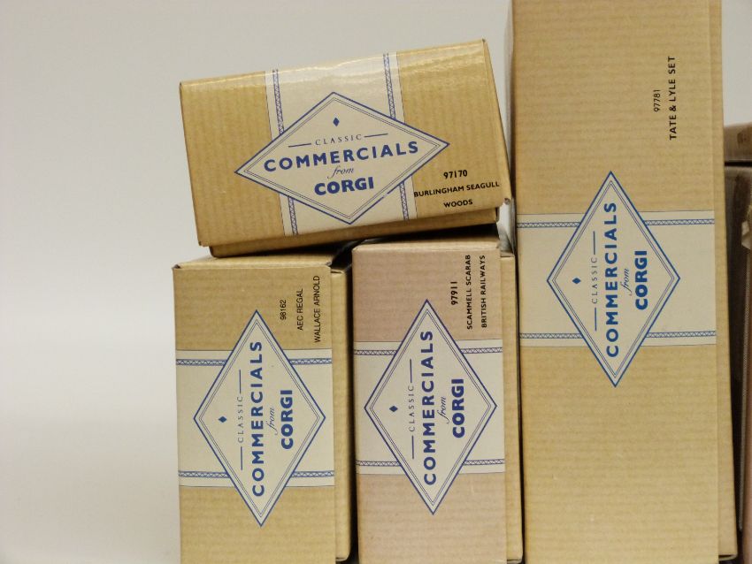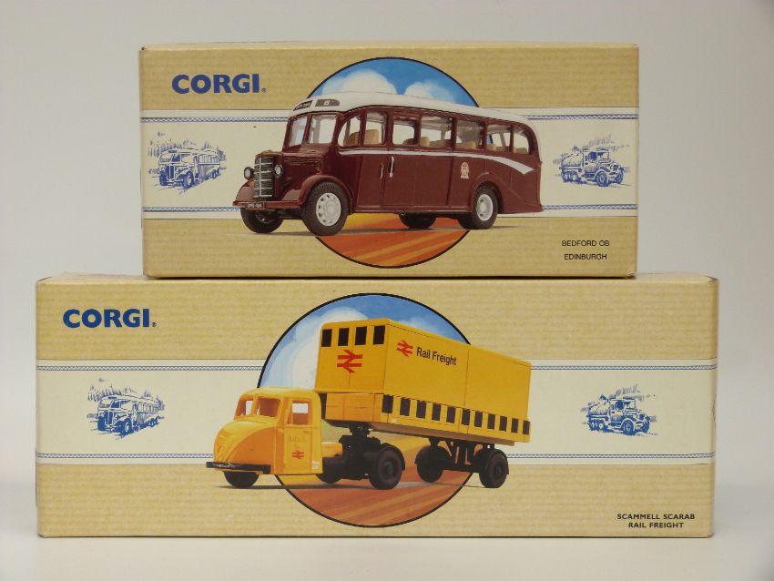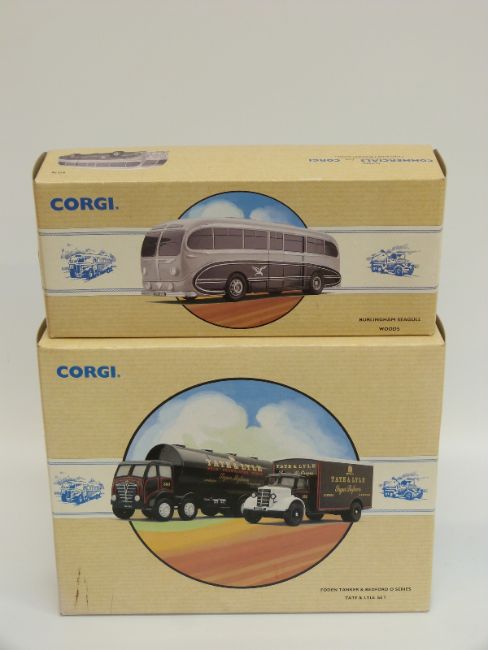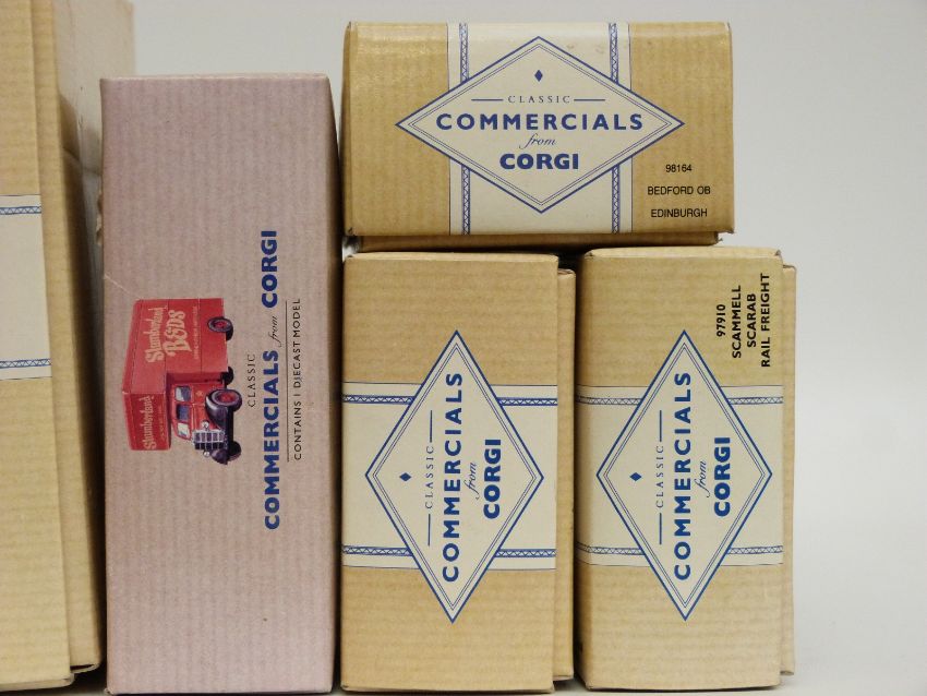Eight Corgi Classic Commercial diecast model vans, buses and lorries Tate and Lyle Set 97781, Rail Freight 97910, British Railways 97911, Edinburgh 98164, Maypole 97210, Wallace Arnold 98162, Woods 97170 and Slumberland Beds 97085, all in original boxes