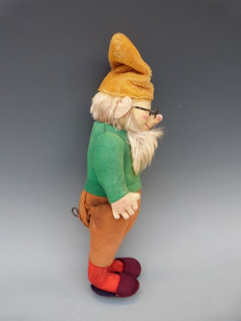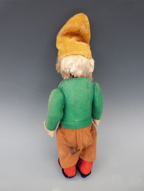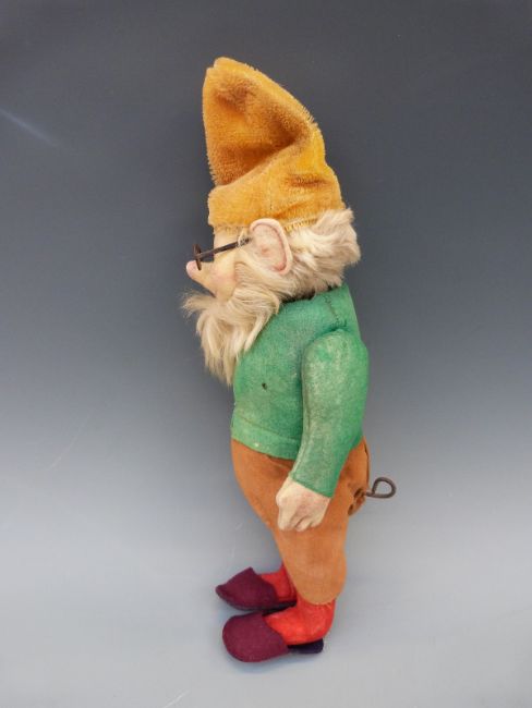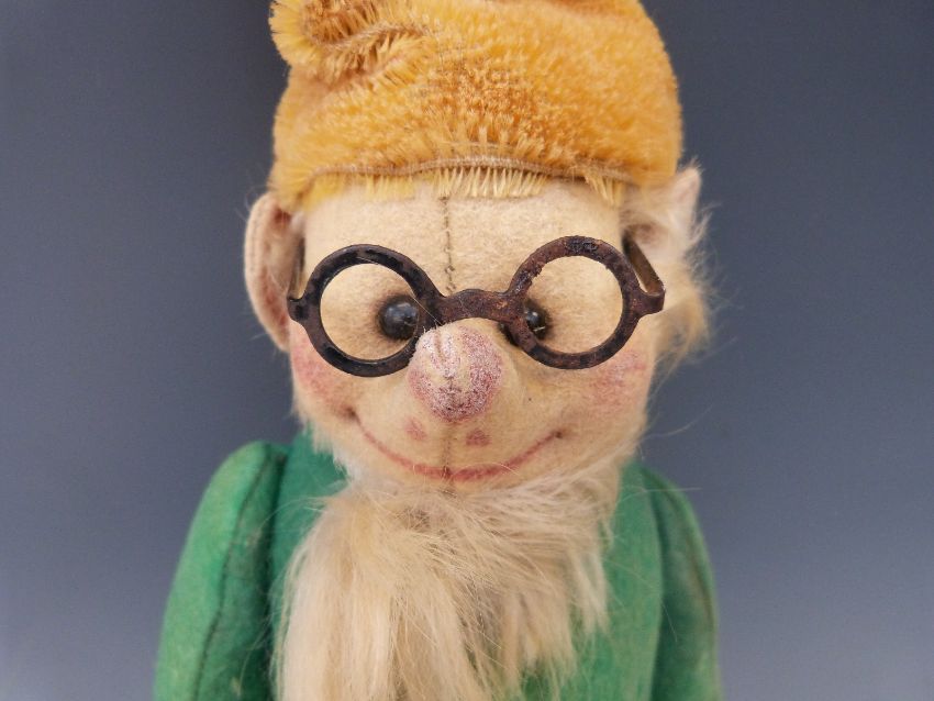 Schuco Yes No Gnome with felt outfit, mohair beard and hat and metal glasses, 36cm tall.