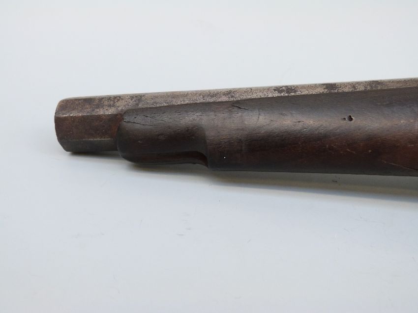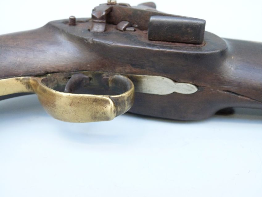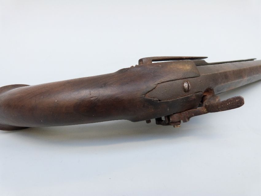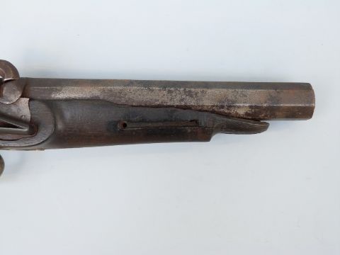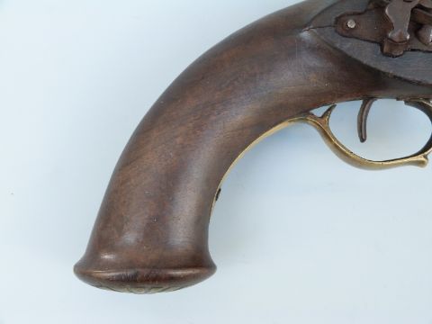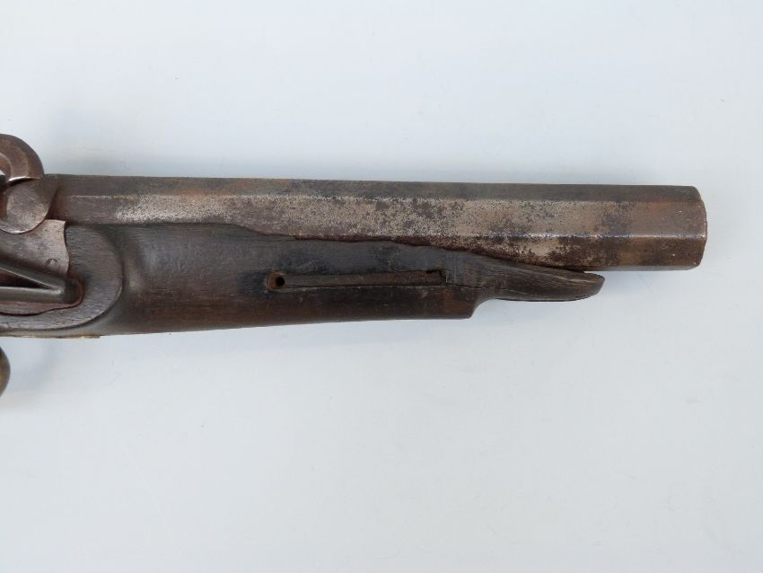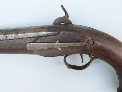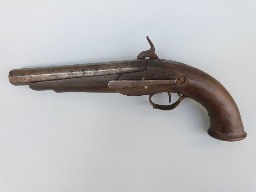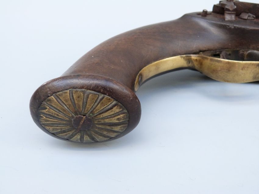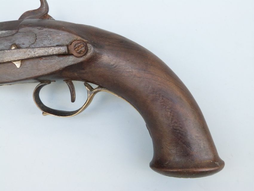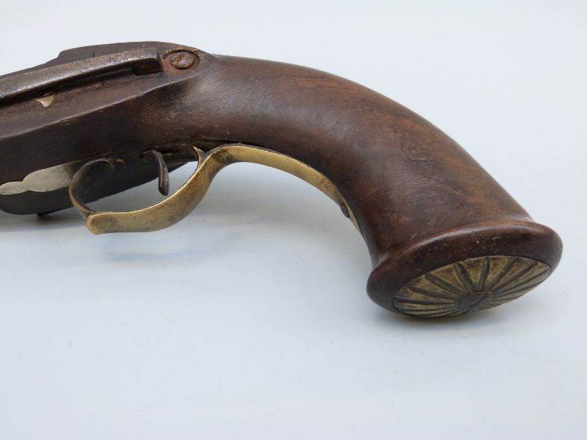 Percussion hammer action belt pistol with Roman lock, brass trigger guard, brass star butt plate, belt hook, shaped hammer and 7.5inch octagonal barrel, overall length 38cm.