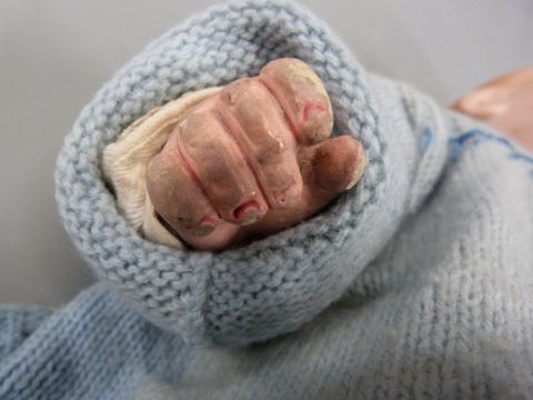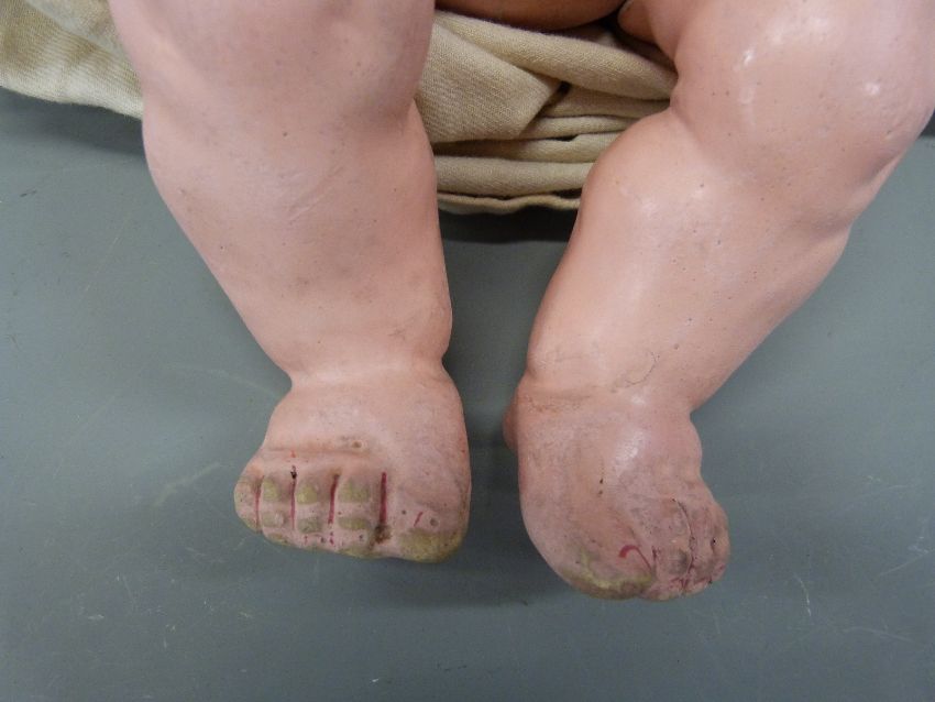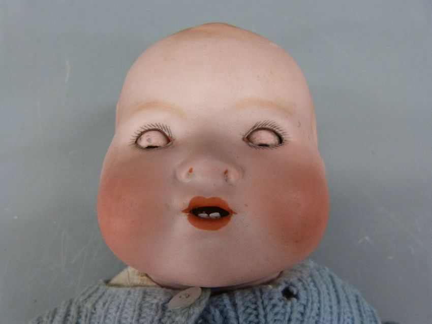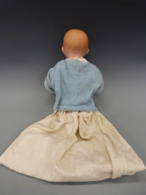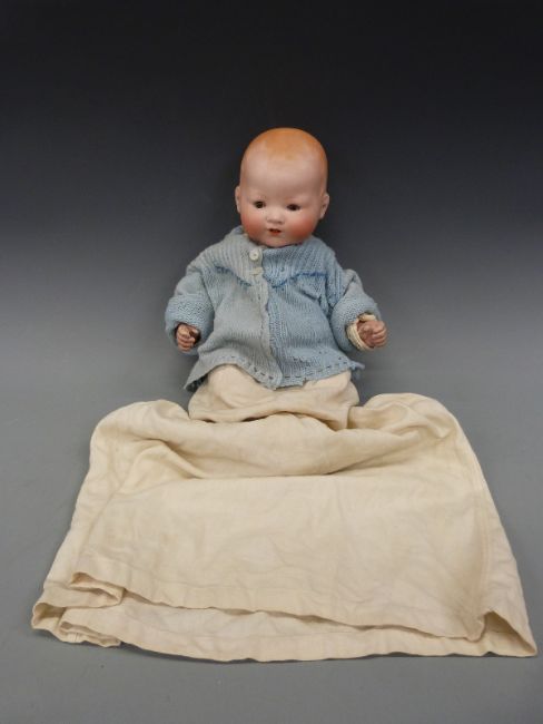 An Armand Marseille bisque headed baby doll with open mouth, weighted brown eyes and composite limbs, in cream christening robe and wool jacket marked to back of neck 351.14K, approximately 38cm long