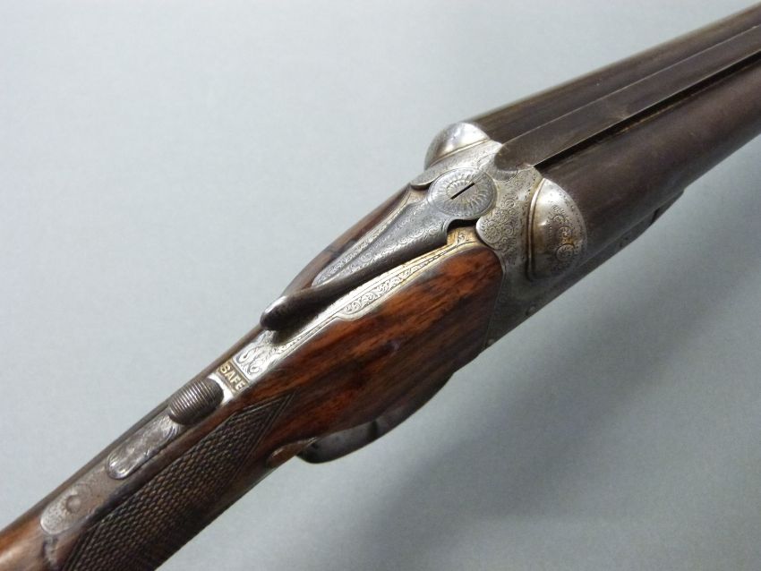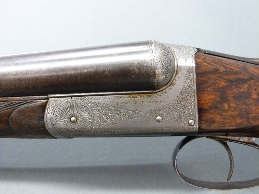 WITHDRAWNÂ Samuel R Allport 12 bore side by side shotgun with named and engraved locks, double trigger, chequered grip and forend, teardrop and vacant cartouche to the walnut stock and 30 inch Damascus barrels engraved 'Saml R Allport, 50. Whittall St, Birmingham.', overall length 116cm, length of pull 35cm, serial number 8941. PLEASE NOTE THIS GUN IS BEING SOLD AS STOCK AND ACTION ONLY AND A VALID RELEVANT FIREARMS/SHOTGUN CERTIFICATE IS REQUIRED TO HANDLE/PURCHASE THIS ITEM.
