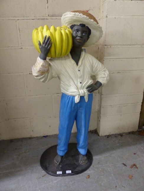 A shop display model of a young boy with hat and a bunch of bananas, 117cm tall