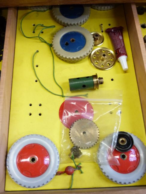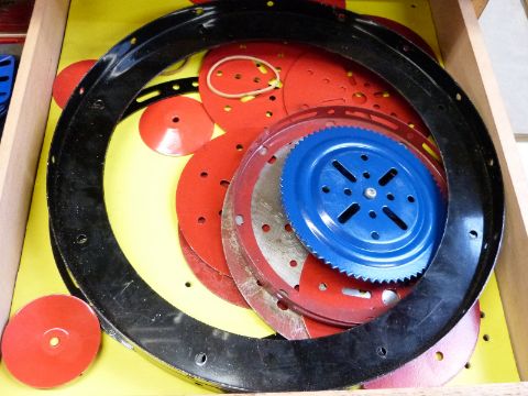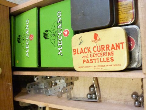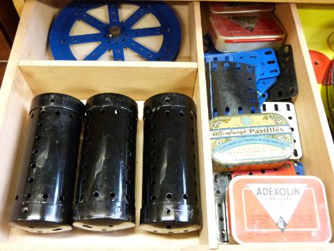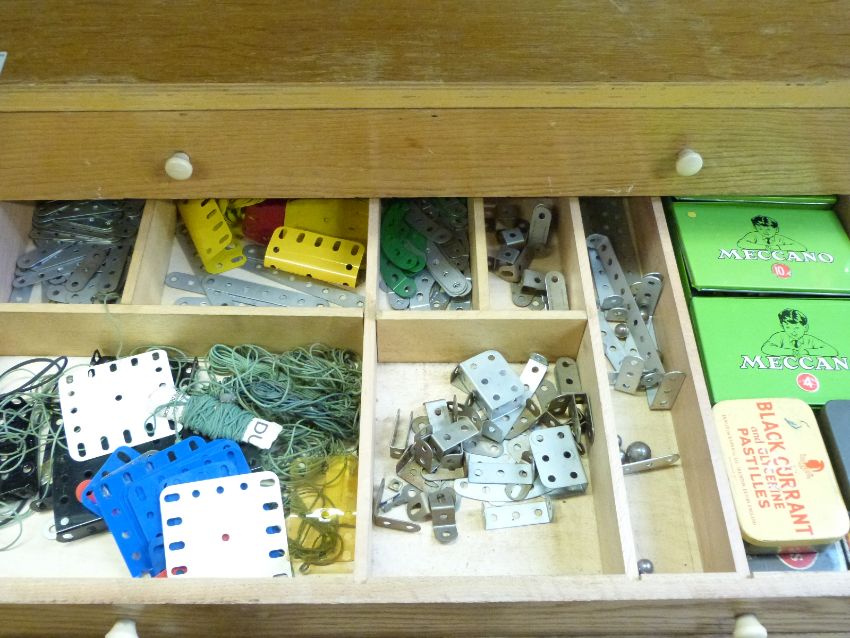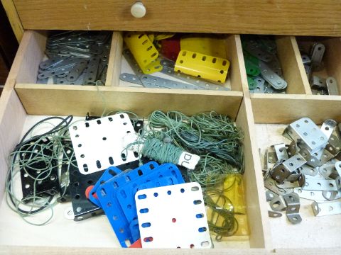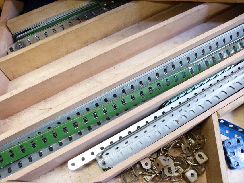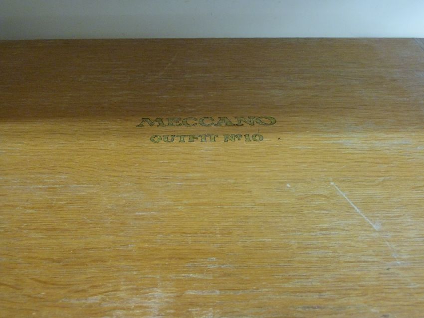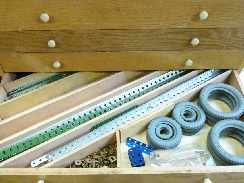 Meccano outfit No 10 comprising mainly black, silver and blue parts in original wooden drawers.