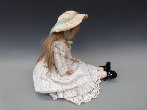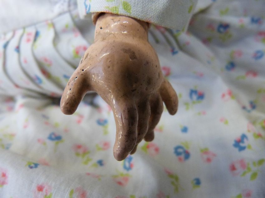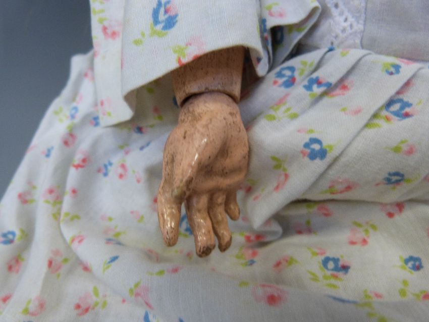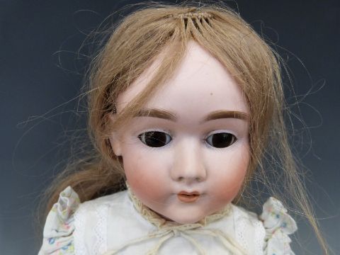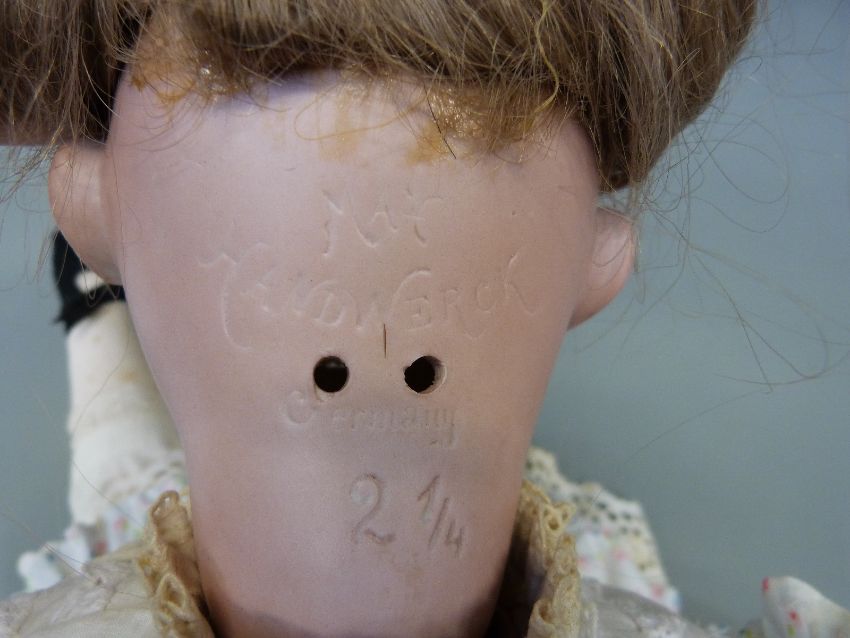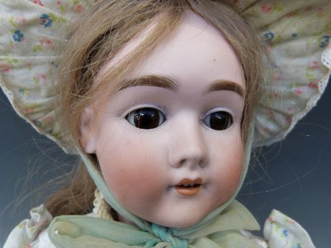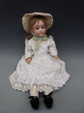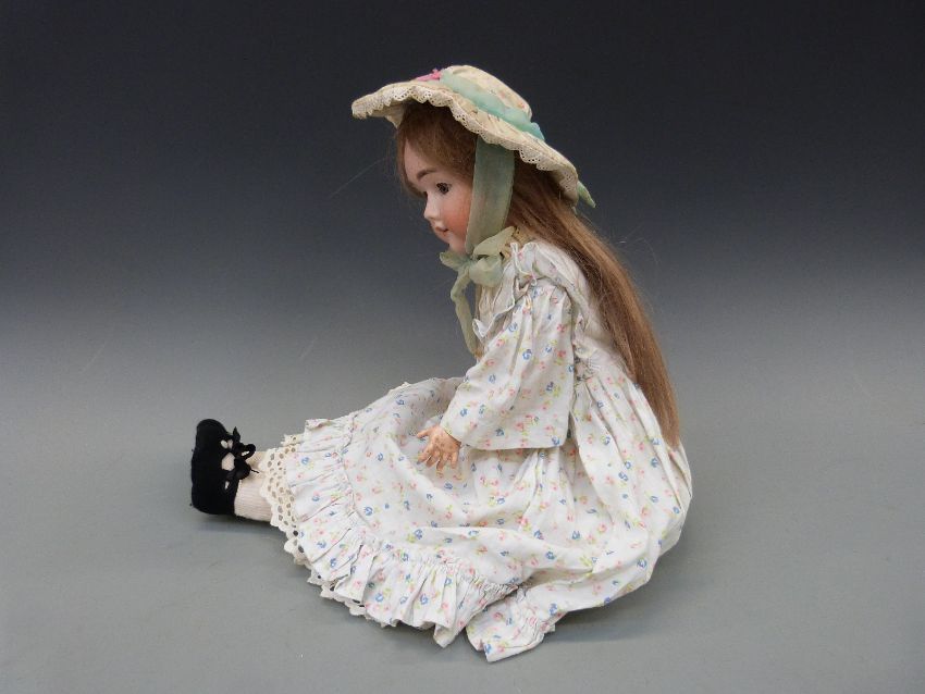 A Heinrich Handwerck bisque headed girl doll with open mouth, weighted brown eyes and jointed composition body in cotton floral dress, marked 'Handwerck Germany 2 ΒΌ', approximately 60cm high