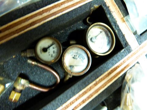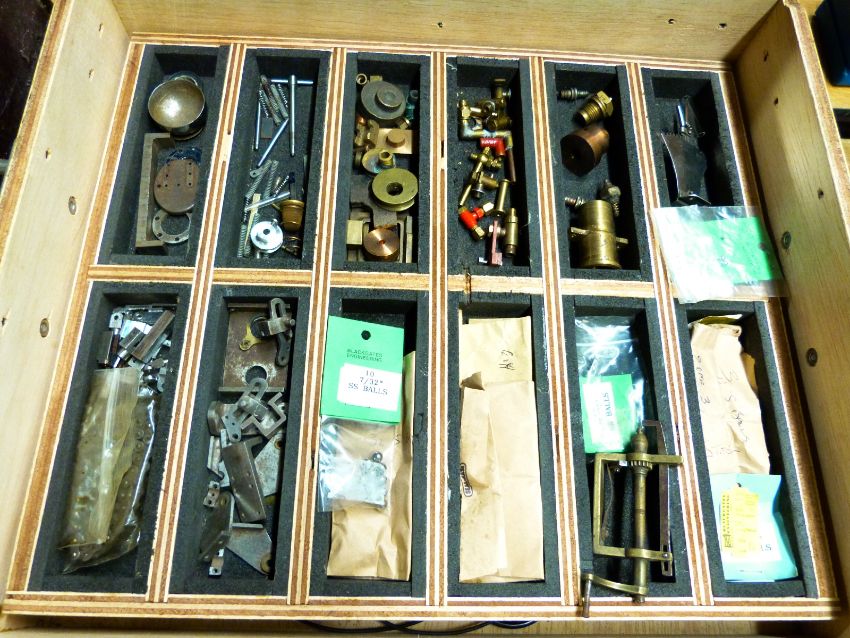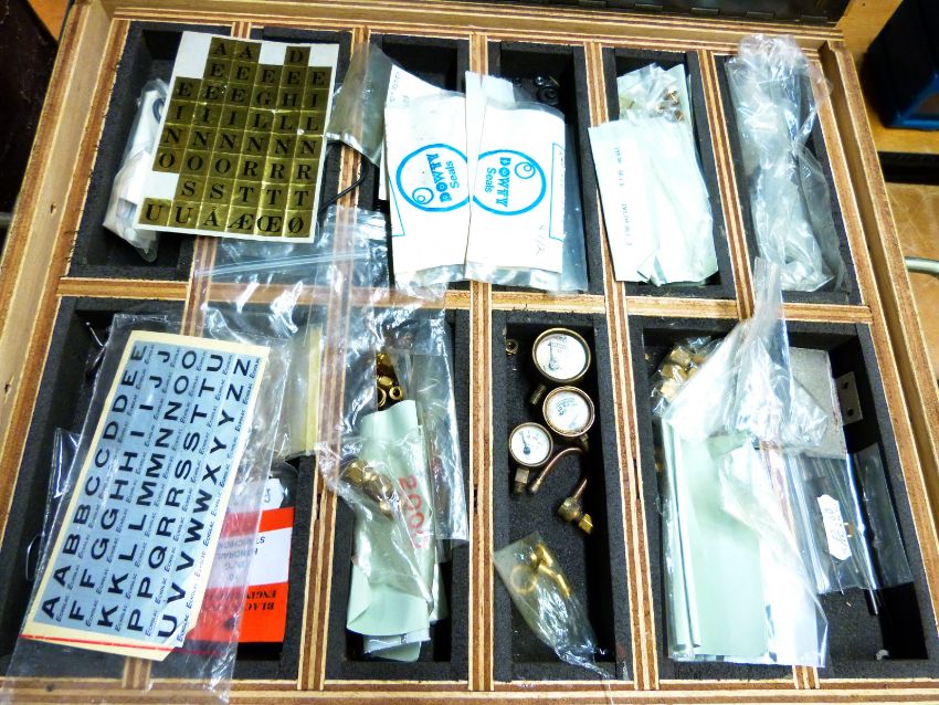 A box of model engineering items including live steam pressure gauges, reversing quadrant, nuts and nipples etc