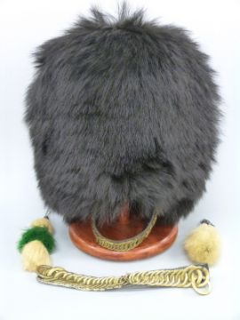 A Foot Guards bearskin hat, on wooden display stand