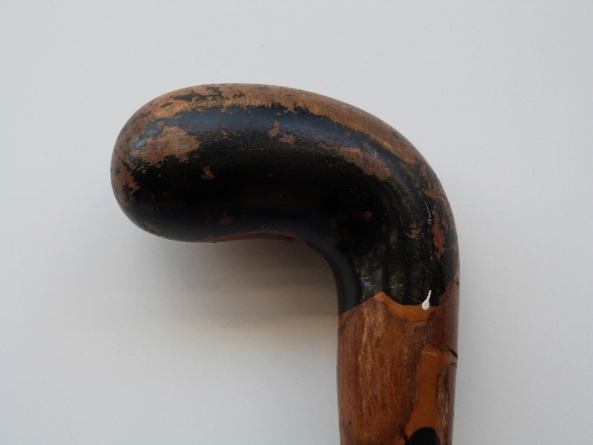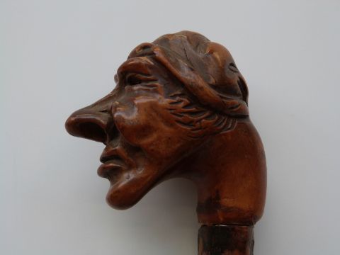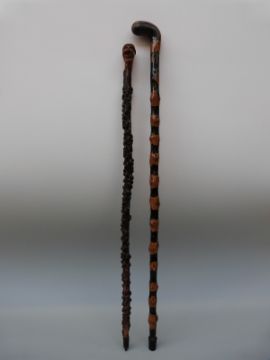 Two late 19th/early 20thC walking sticks comprising a carved briar stick with grotesque pirate head carving and a Golf Sunday stick