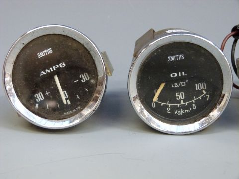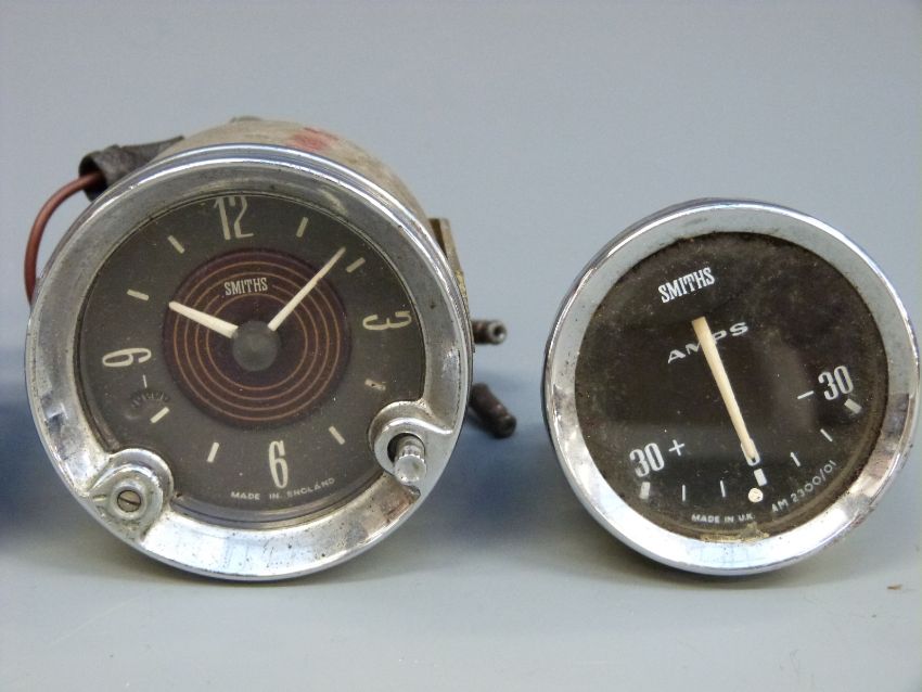 Four Smiths classic car gauges including ammeters, oil pressure and clock