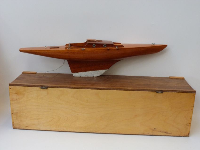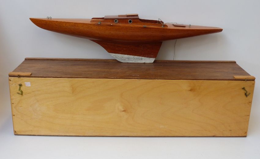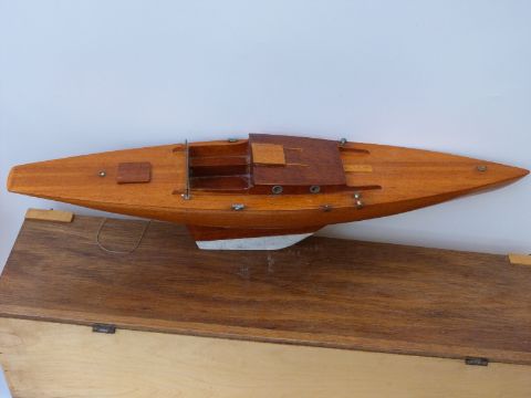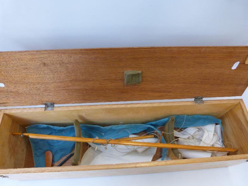 A wooden model of a sailing/ pond yacht on stand in wooden travel box.