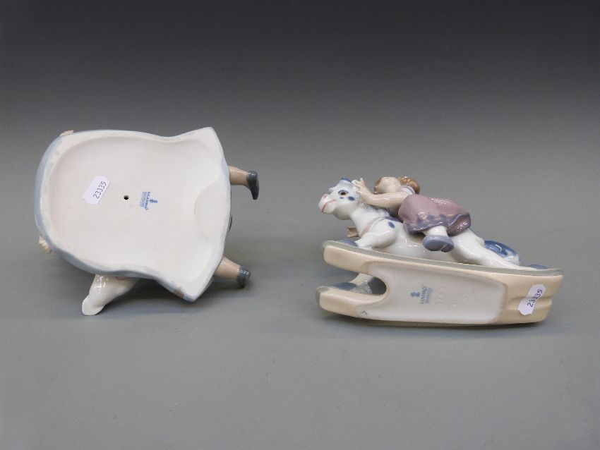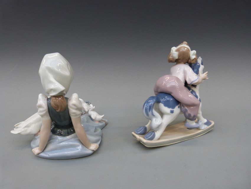 Two Lladro figures, a girl with ducks "My Hungry Brood" and a girl on a rocking horse "Faithful Steed"