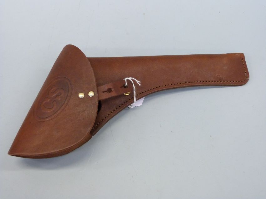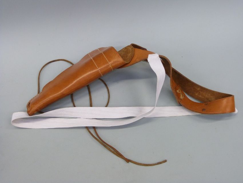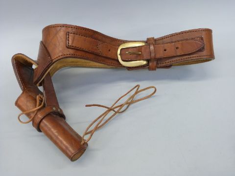 Five leather revolver holsters, two on matching belts, some with embossed decoration.