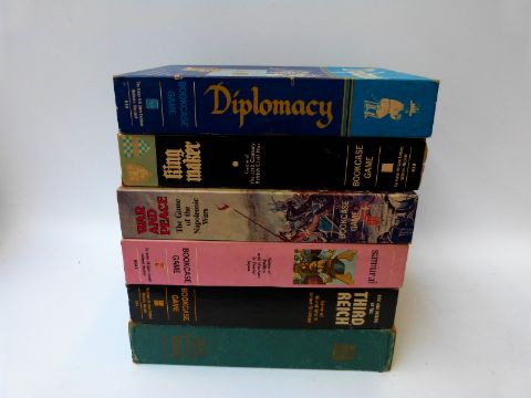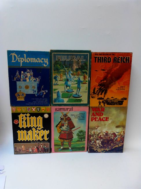 Six Avalon Hill bookcase games King Maker, War and Peace, Samurai, Third Reich, Feudal and Diplomacy, all in original boxes