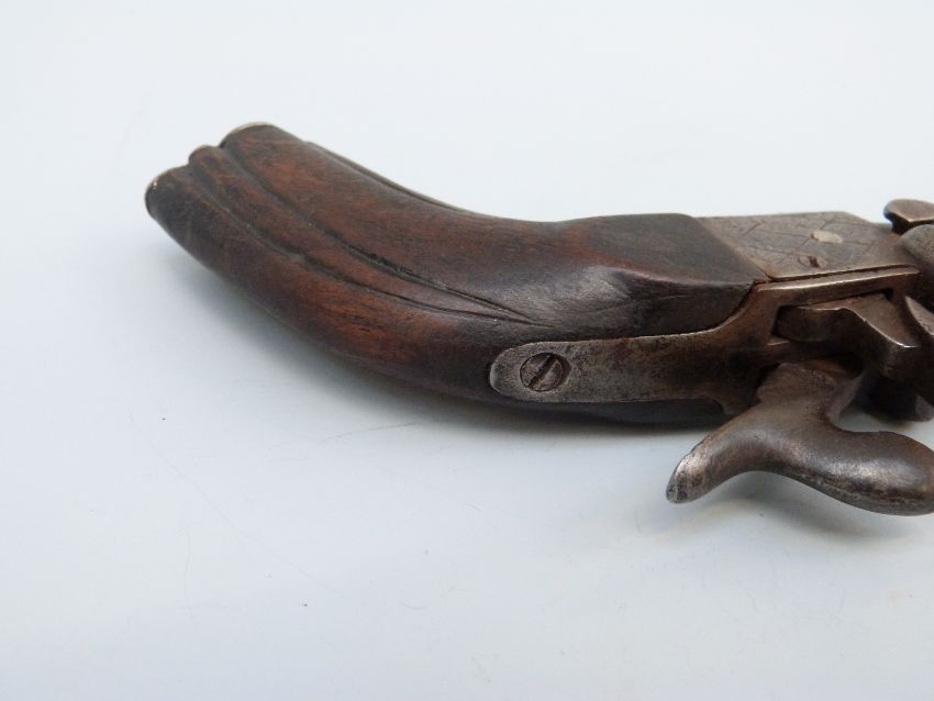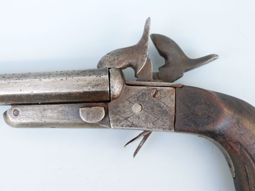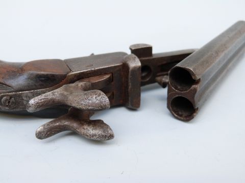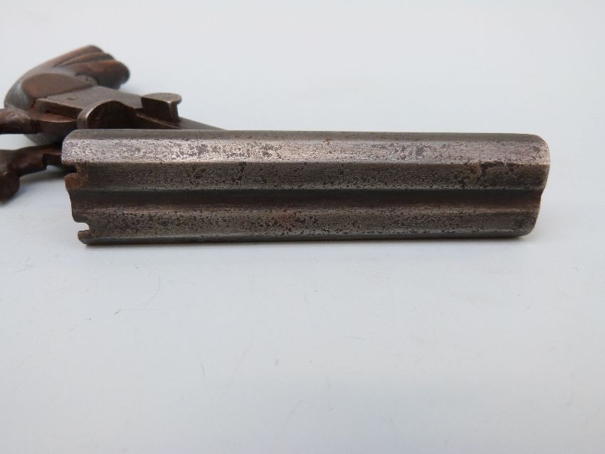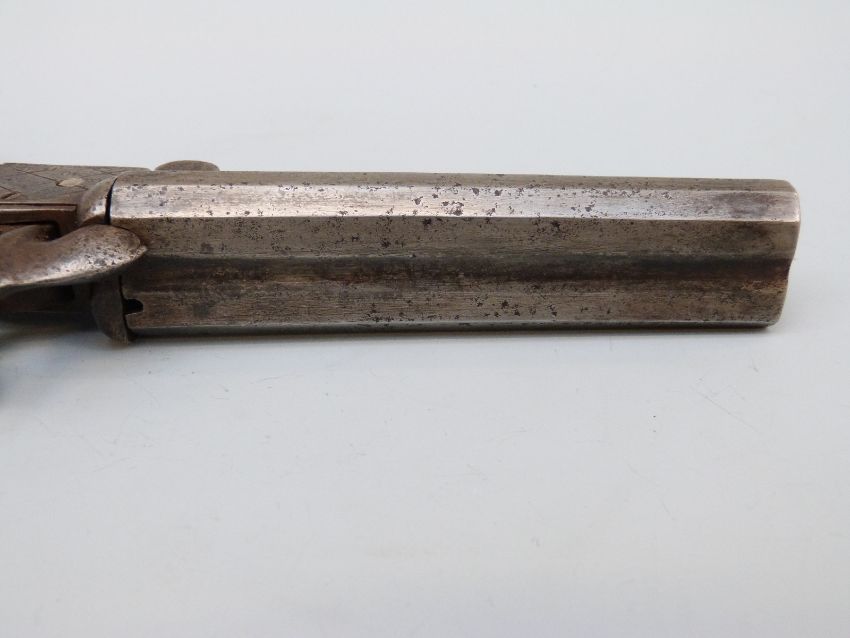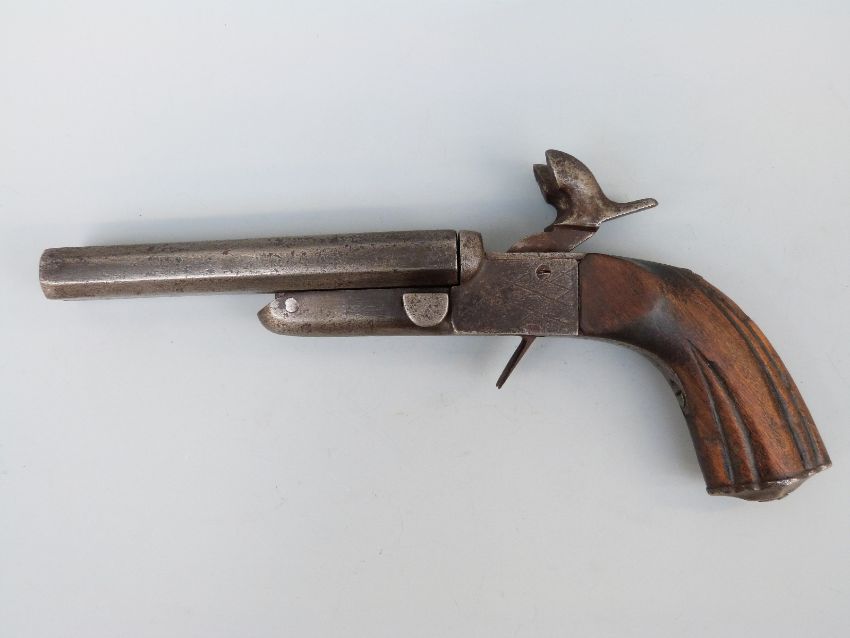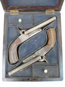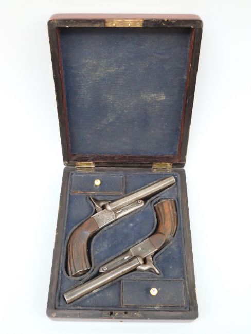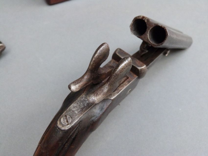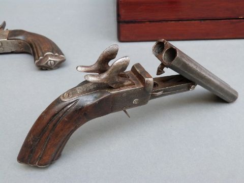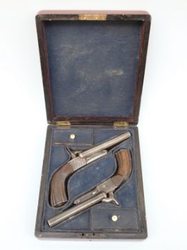 A pair of percussion hammer action side by side pistols with chequered locks, carved reeded grip, shaped butt cap, folding triggers and 4.5 inch octagonal rifled barrels, overall length 23cm in lockable fitted mahogany box with boxwood inlay, lined interior and ivory handled storage compartment
