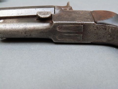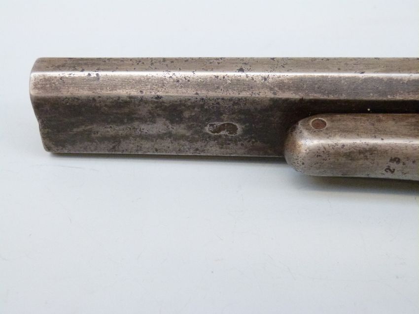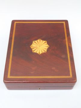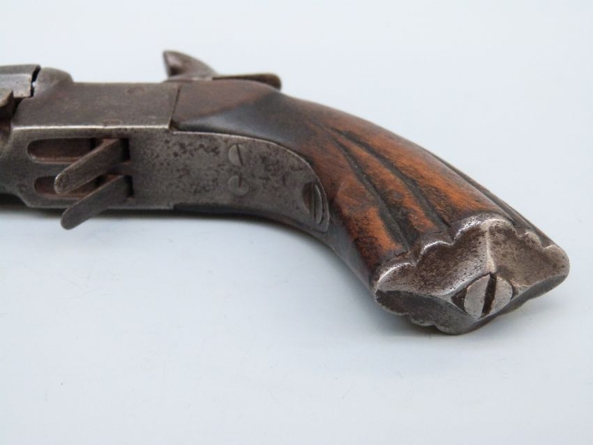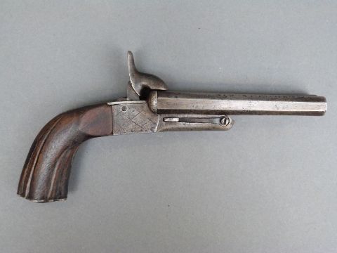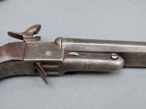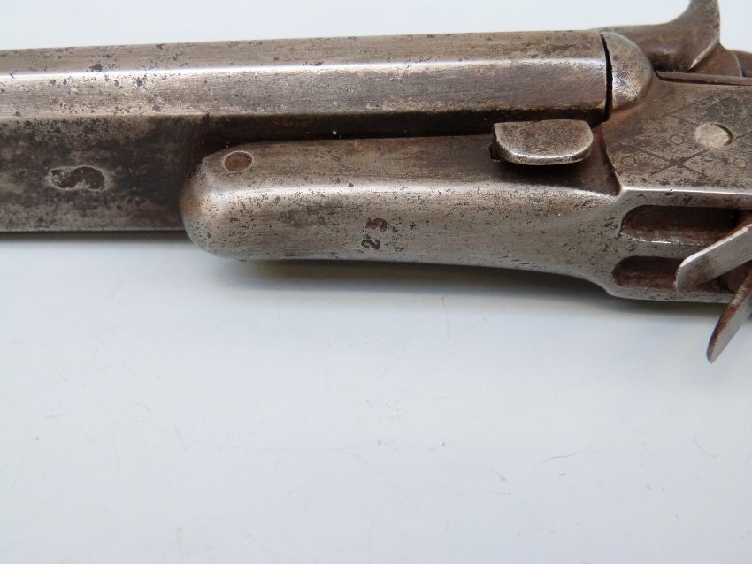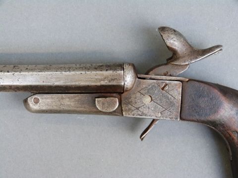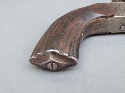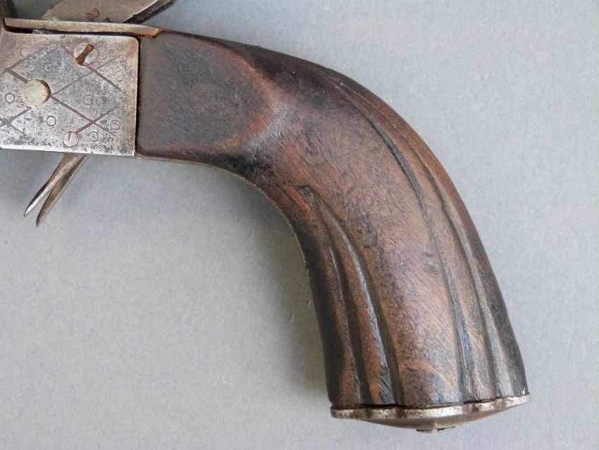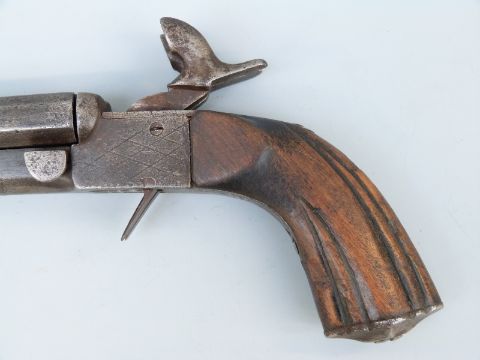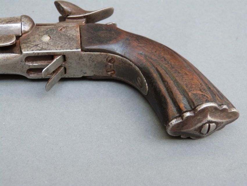 A pair of percussion hammer action side by side pistols with chequered locks, carved reeded grip, shaped butt cap, folding triggers and 4.5 inch octagonal rifled barrels, overall length 23cm in lockable fitted mahogany box with boxwood inlay, lined interior and ivory handled storage compartment