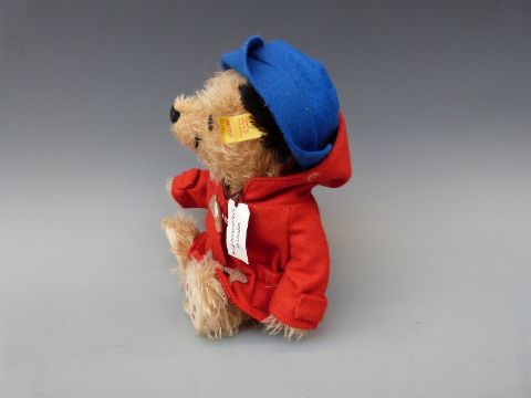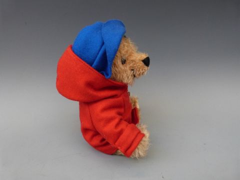 Steiff Teddy bear Paddington Bear with brown mohair, red coat, blue hat and jointed limbs, 22cm tall, in cloth bag