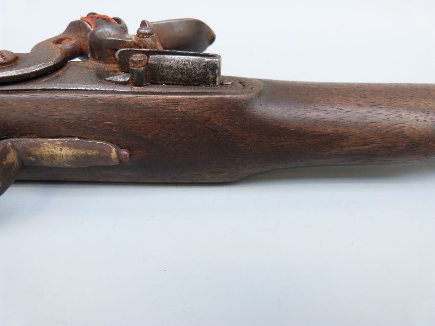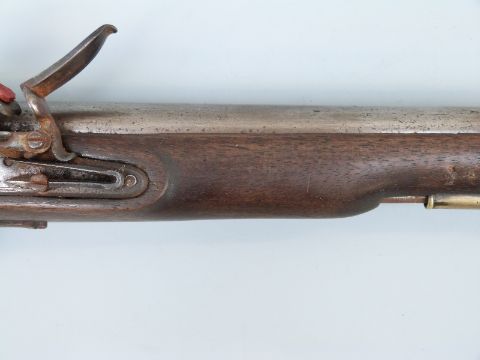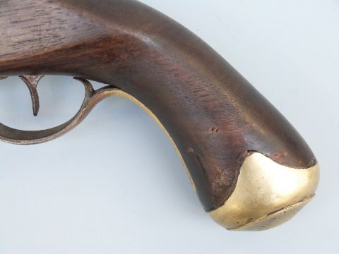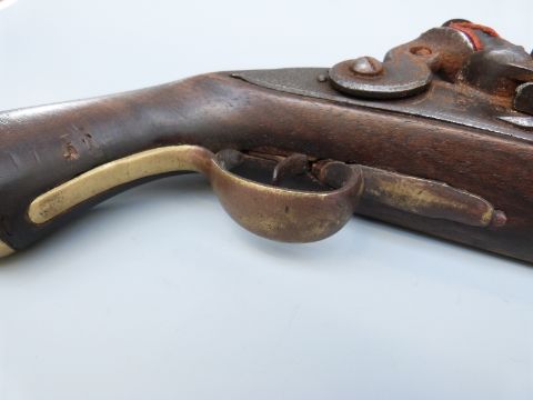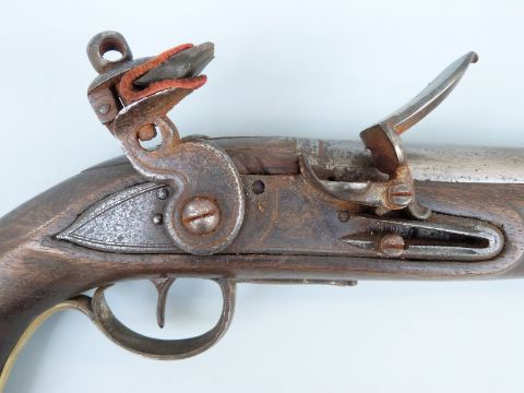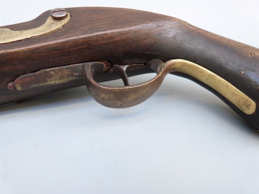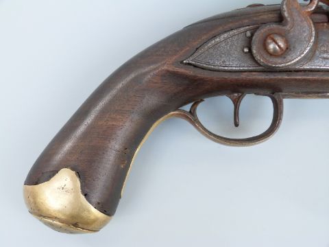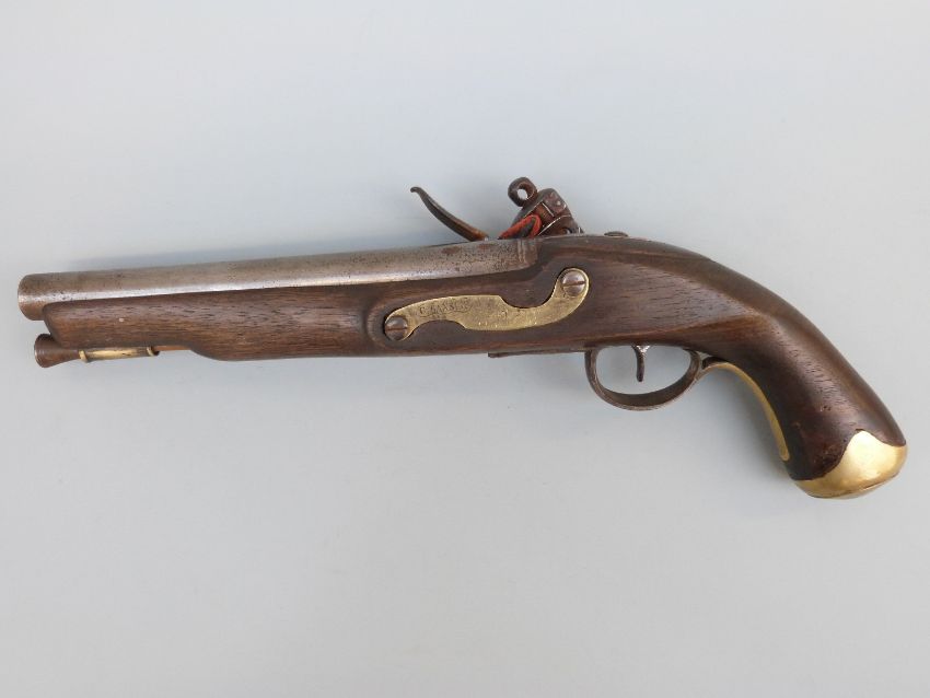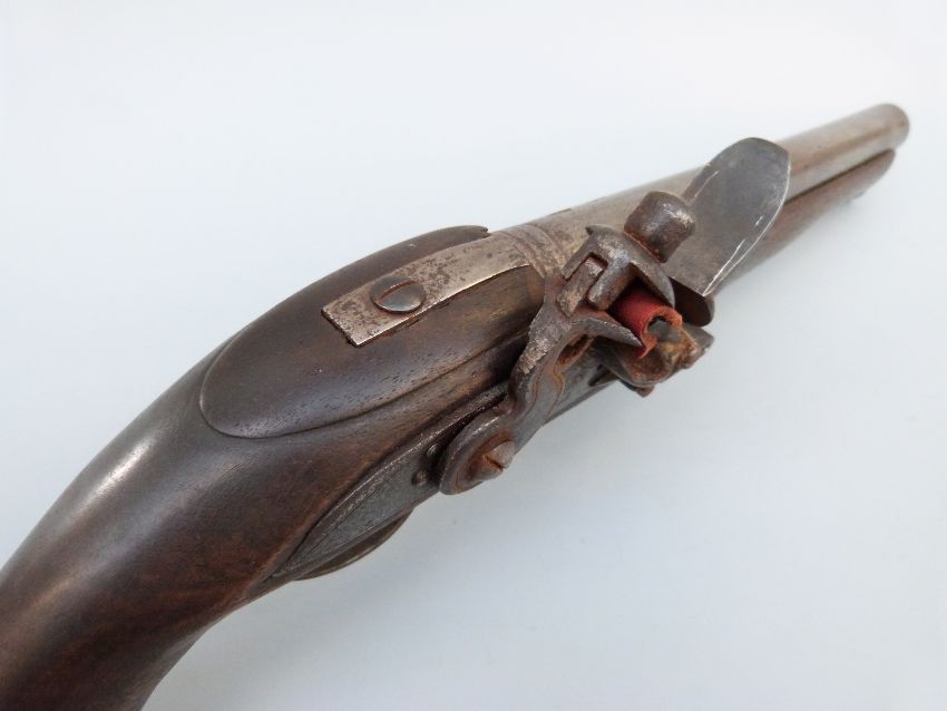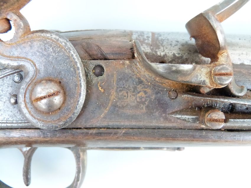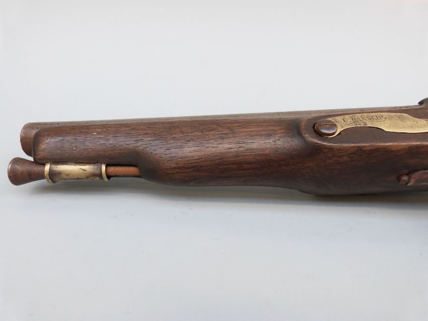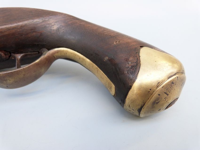 Flintlock hammer action Dragoon pistol with unusual jaw mechanism to the hammer, lock plate stamped with crown cypher, brass trigger guard, butt plate and mounts, steel ram-rod, 'C.Hanslip' engraved to one side and 9 inch barrel stamped with proof marks, overall length 40cm.